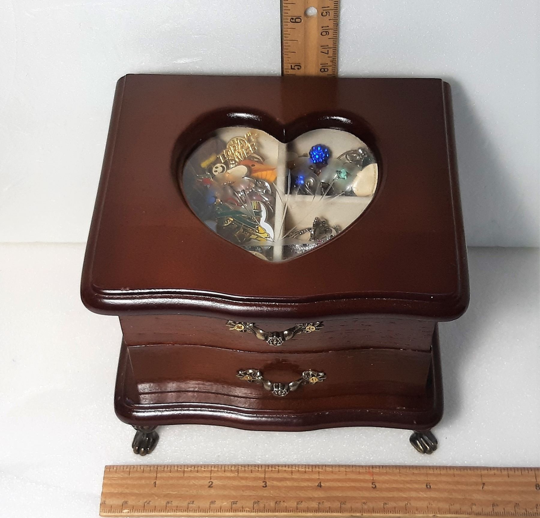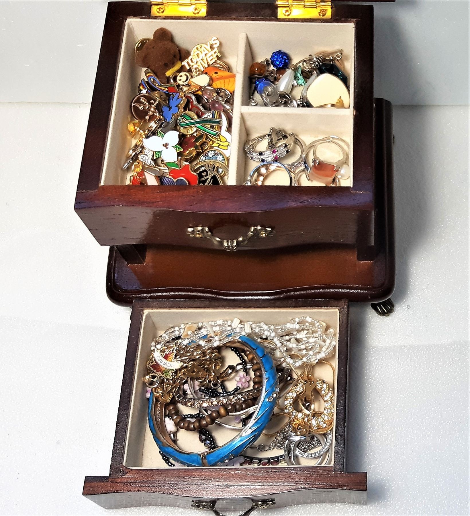 JEWELLERY BOX AND CONTENTS INCLUDING: EARRINGS, LAPEL PINS, RINGS, BRACELETS & NECKLACES. JEWELLERY