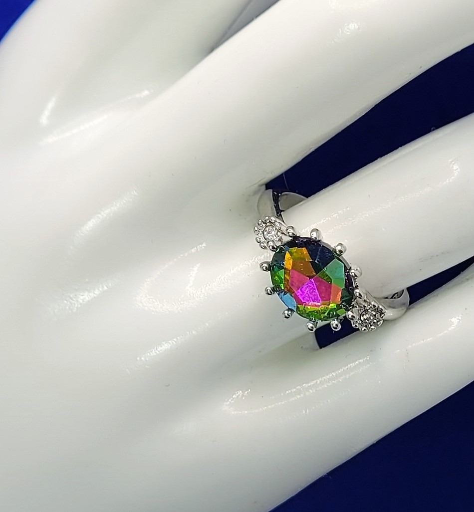 CRYSTAL RING SET ON THE HORIZONTAL, STAMPED 925 SILVER, SIZE 8. JEWELLERY