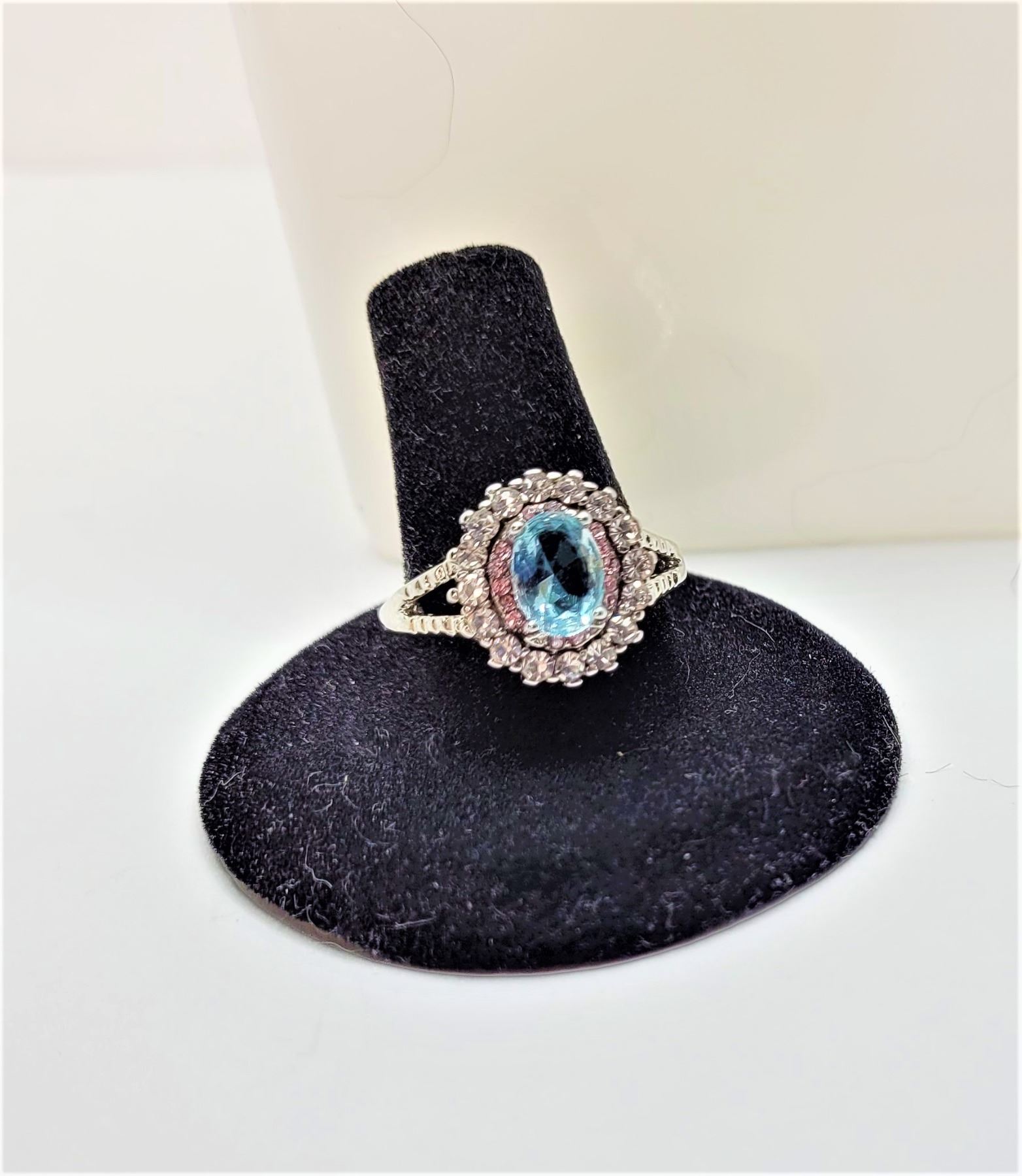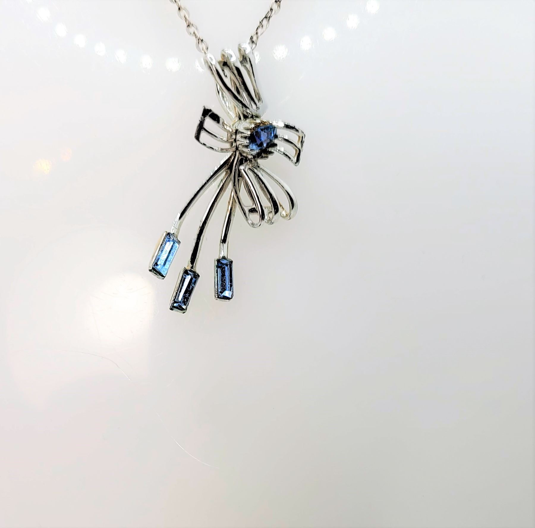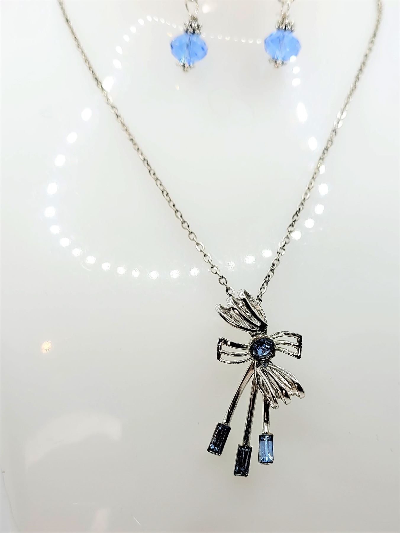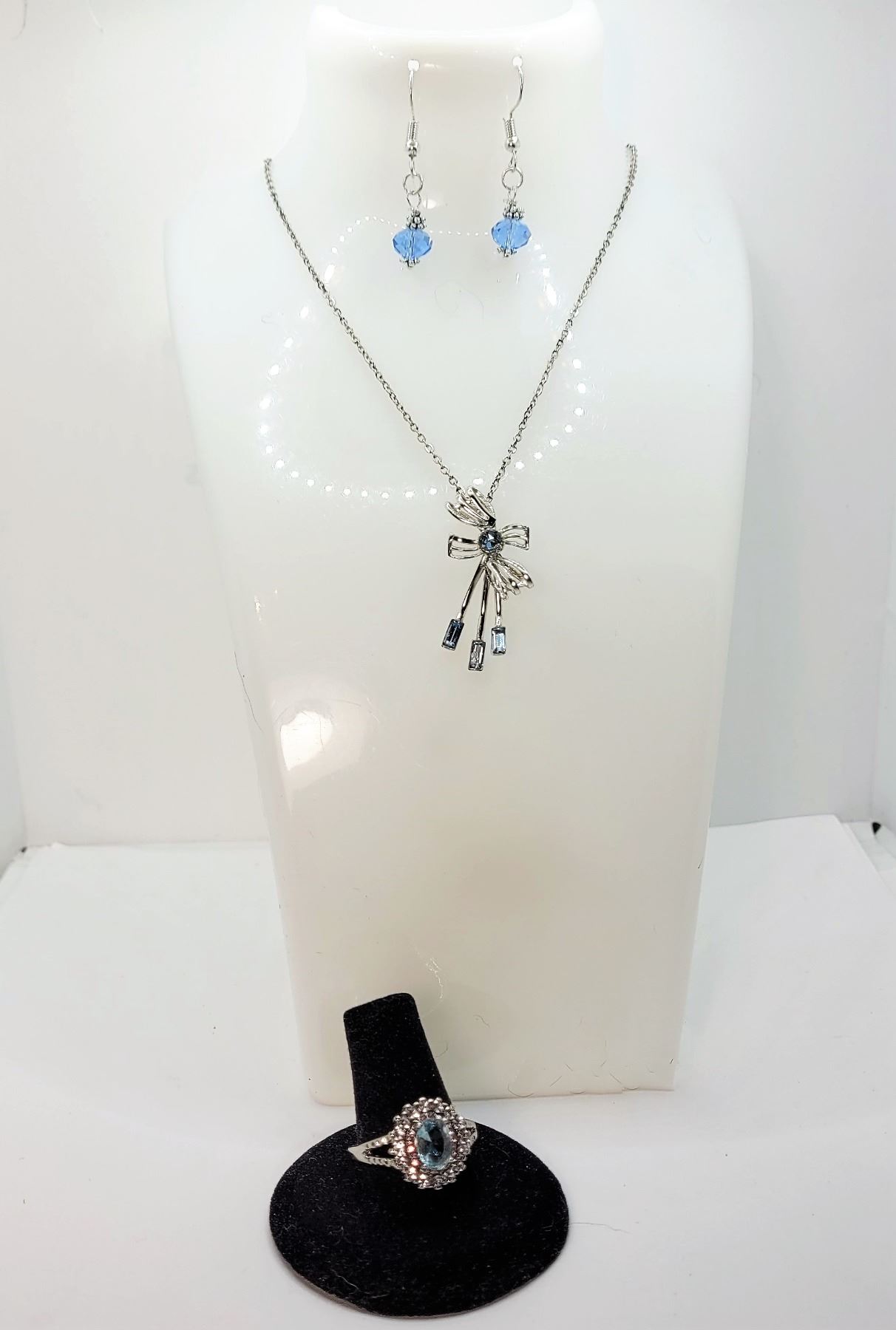OF JEWELRY, INCLUDES: BOW PENDANT WITH BOTH ROUND AND BAGETTE CRYSTALS ON A 22" CHAIN, SWAROVSKI CRYSTAL DROP EARRINGS ON NICKLE FREE FISH HOOK WIRES AND SIZE 8 CLEAR AN PALE BLUE HALO CRYSTAL RING.