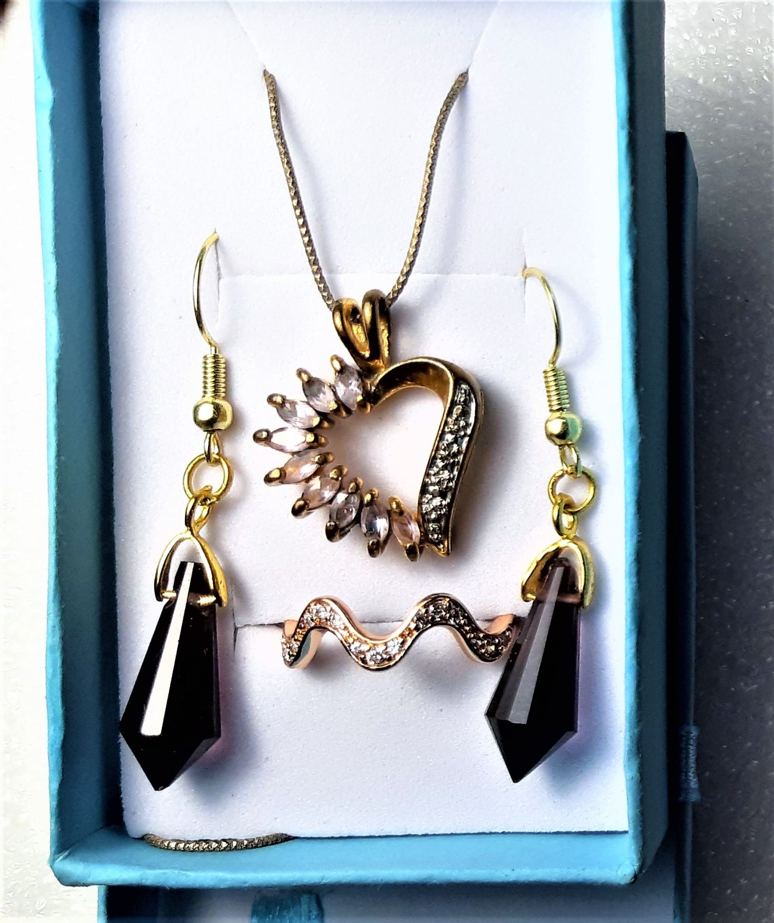 19" FLAT HERRING BONE CHAIN WITH CLEAR AND PALE MAUVE RHINESTONES AND PLUM COLORED SWAROVSKI CRYSTAL DROP EARRINGS, WAVE STYLE RING SET WITH CRYSTALS, SIZE 6.5. JEWELRY
