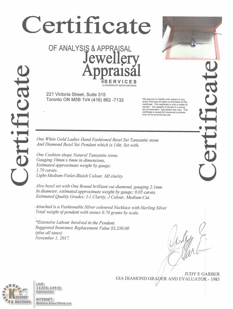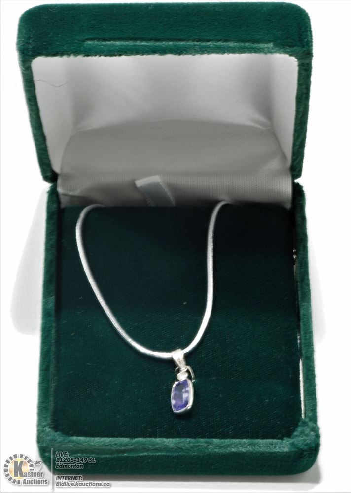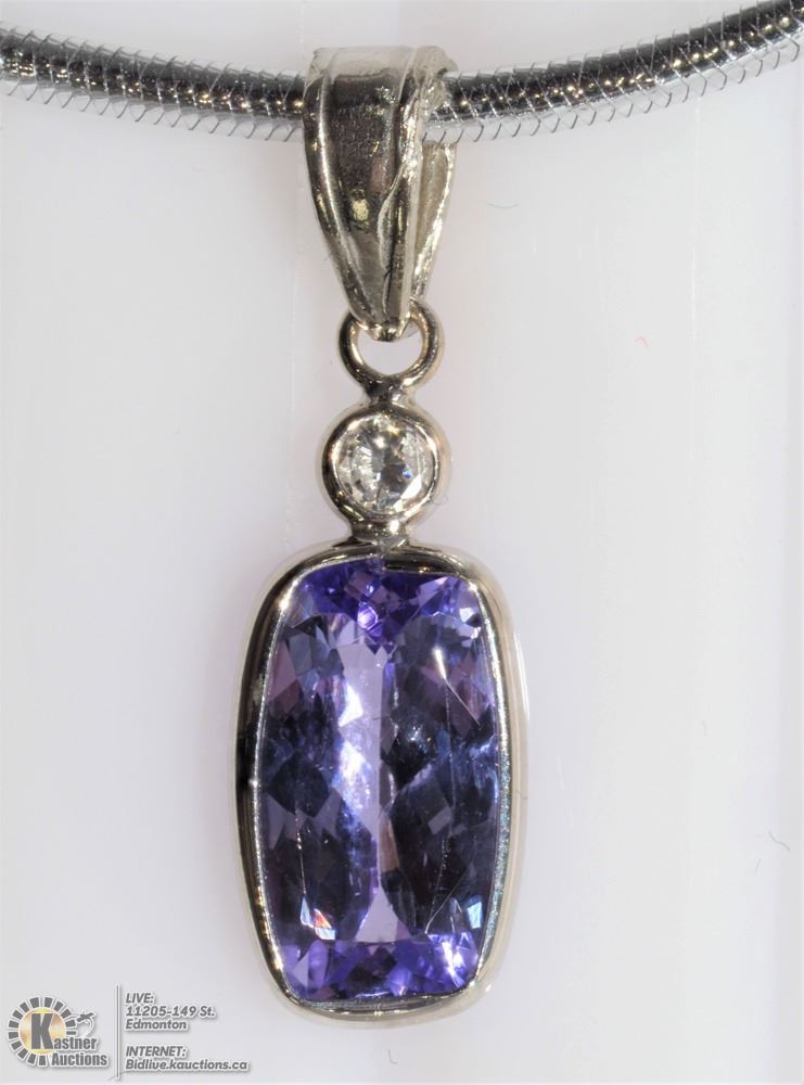 NECKLACE .. 23 - GS86- 14KT WHITE GOLD TANZANITE (1.70CT) AND DIAMOND PENDANT NECKLACE W/COA. SUGGESTED REPLACEMENT VALUE $3350.00. JEWELLERY.