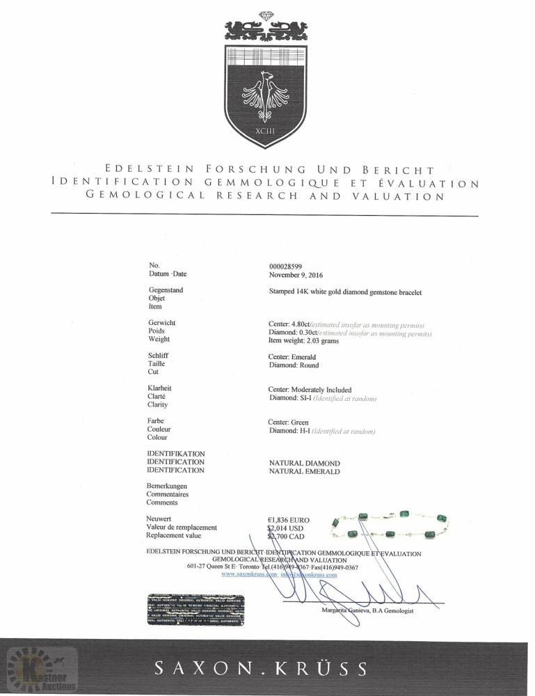14KT WHITE GOLD EMERALD (4.80CT) & DIAMOND (0.30CT) BRACELET W/ COA - SUGGESTED REPLACEMENT VALUE $2,700.00