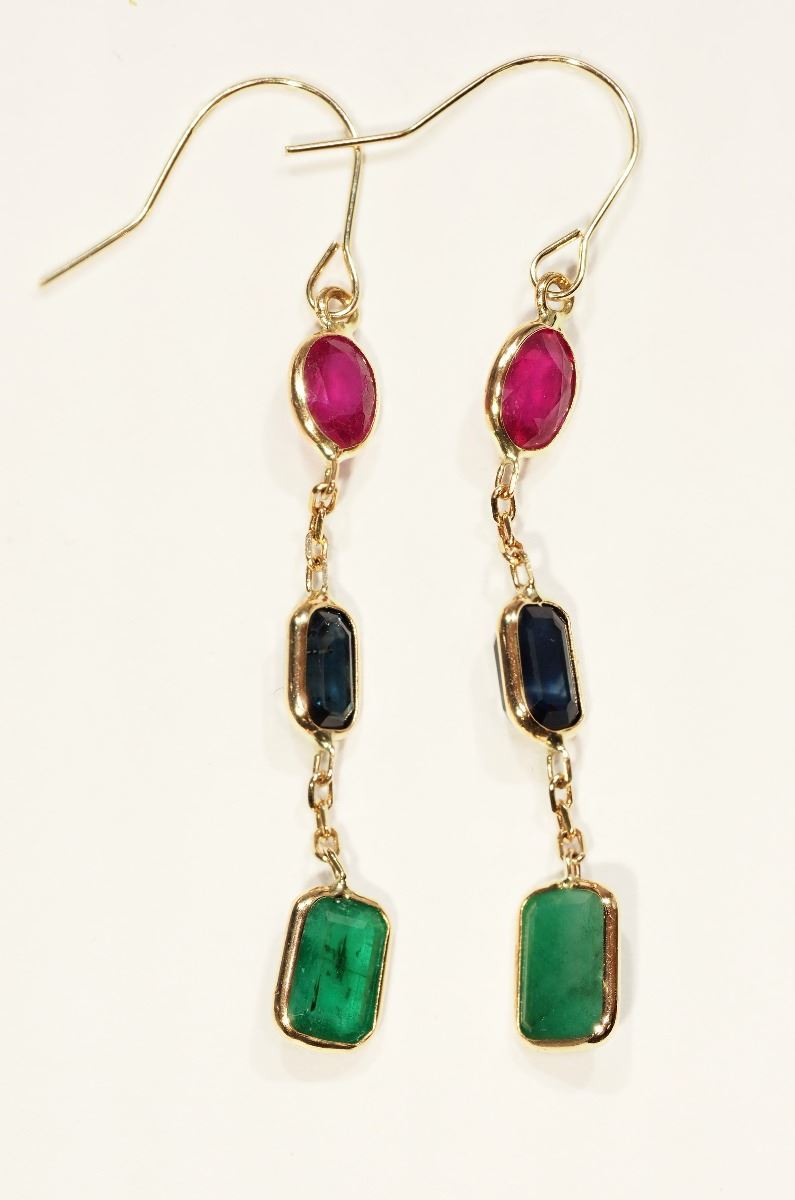 14KT YELLOW GOLD RUBIES SAPPHIRES & EMERALDS EARRINGS. WITH COA- SUGGESTED RETAIL VALUE $900.00