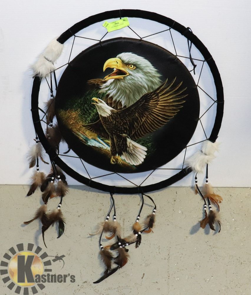 HAS A MAJESTIC EAGLE HEAD SILHOUETTED HIGH IN THE SKY WITH ANOTHER EAGLE FLYING BELOW IT. ADORNED WITH SUEDE, FUR, FEATHERS AND BEADS. MINT CONDITION. RETAILS FOR $160.00. -HOME