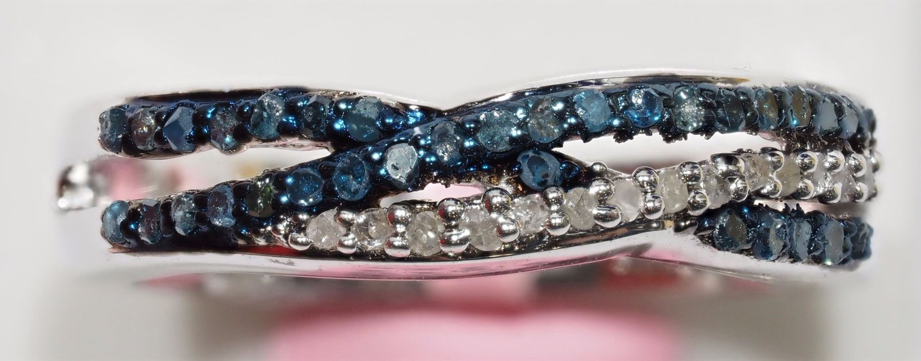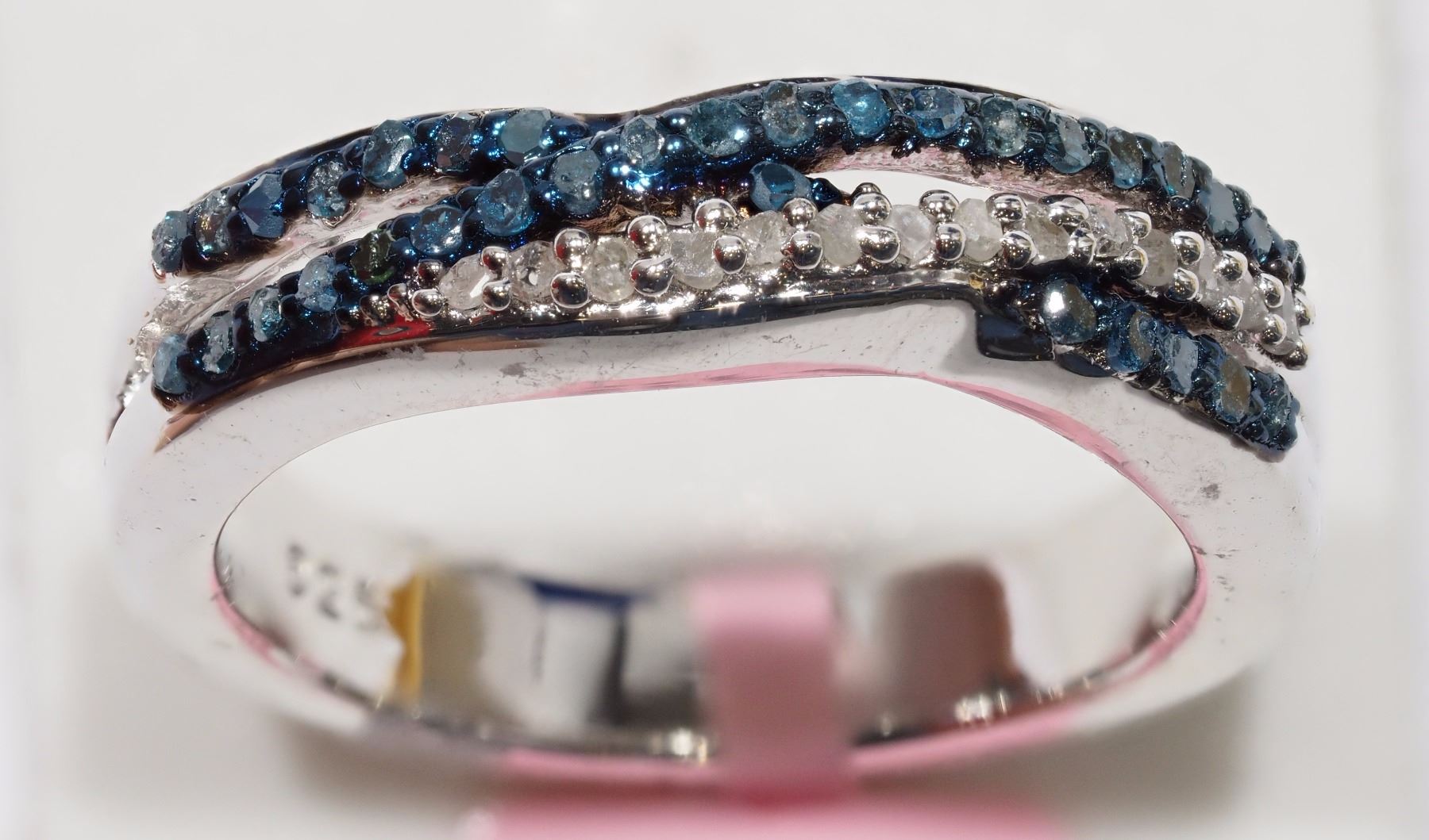 24-NT58- STERLING SILVER BLUE AND WHITE DIAMOND (0.48CT) TWIST RING SIZE 6.5 W/COA. SUGGESTED REPLACEMENT VALUE $999.00. JEWELLERY