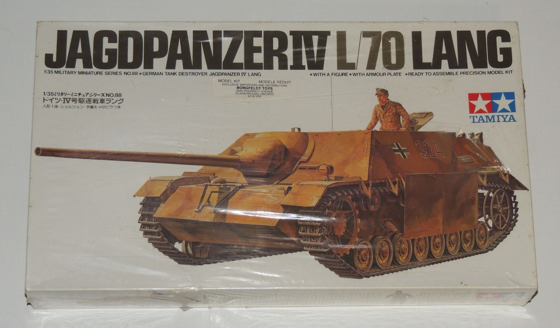 MODEL KIT JAGDPANZER IV L/70 LANG GERMAN PANZER TANK TAMIYA MADE IN JAPAN SEALED MODEL KIT NEW OLD STOCK NOS - FROM BUYOUT OF 1980'S BRITISH TOY STORE, INCLUDING MODEL KITS, DIECAST METAL CARS & VEHICLES, TRAINS, VINTAGE AND INTERNATIONAL COLLECTABLES INCLUDING LATER 1990'S TOYS AND EARLY 1960'S TOYS AND MORE