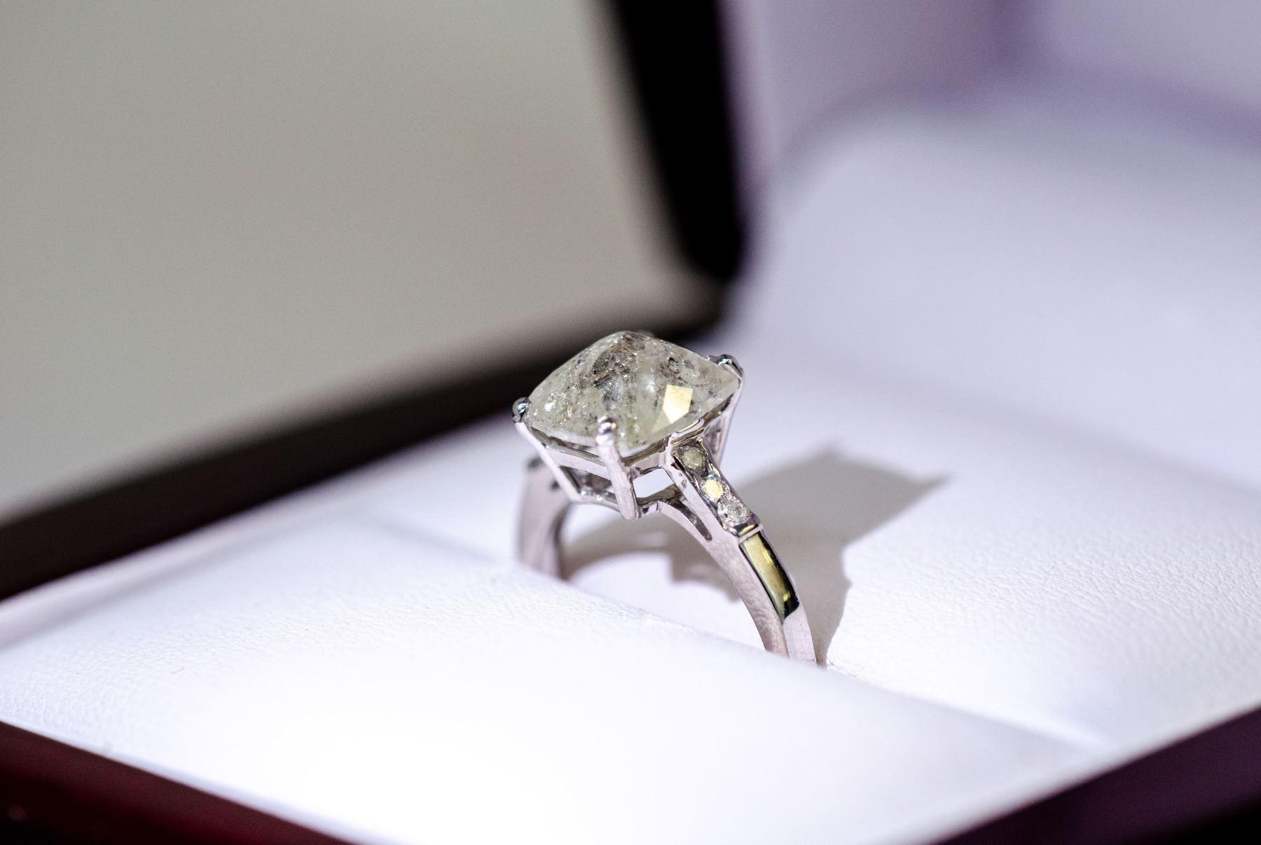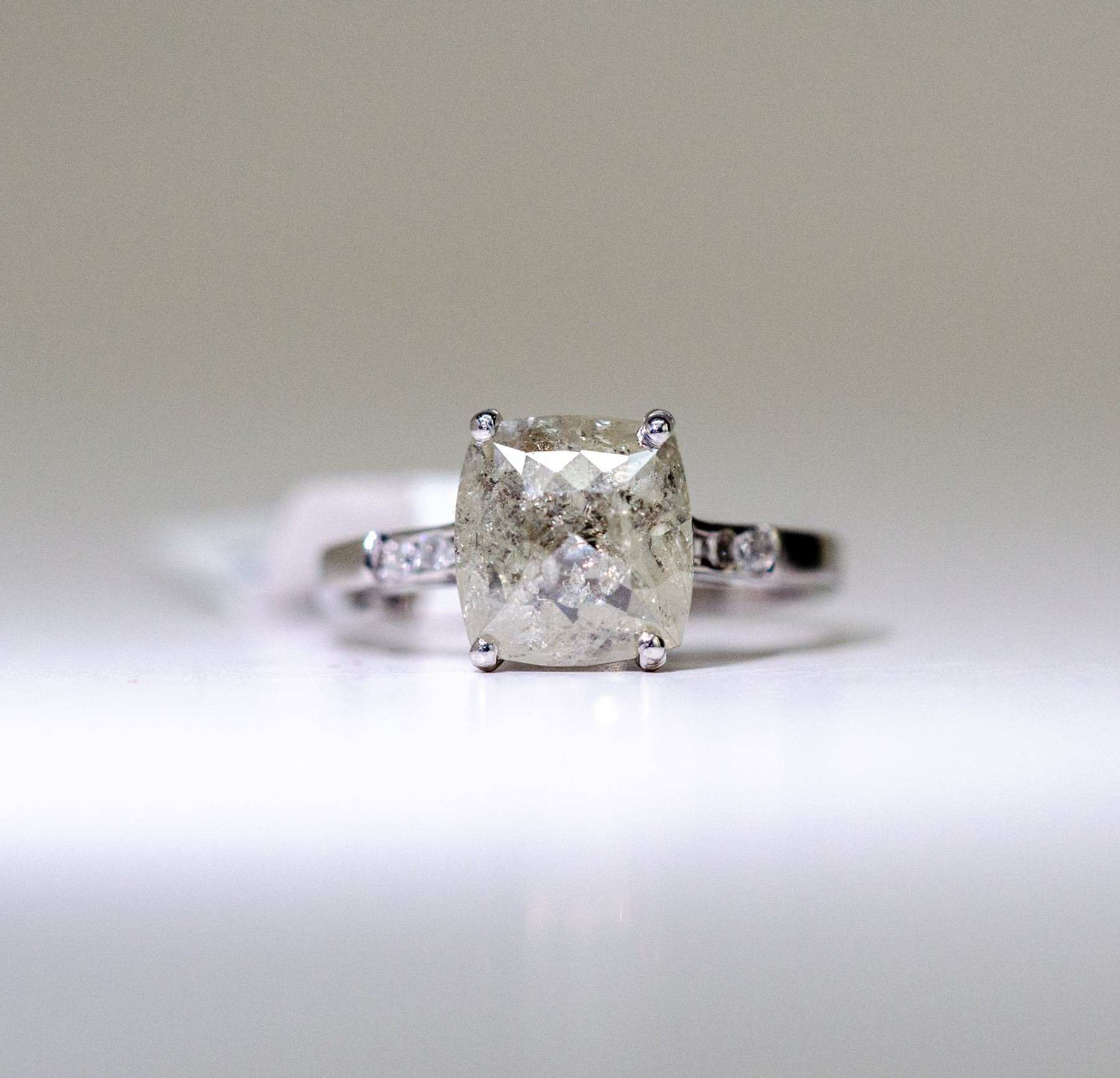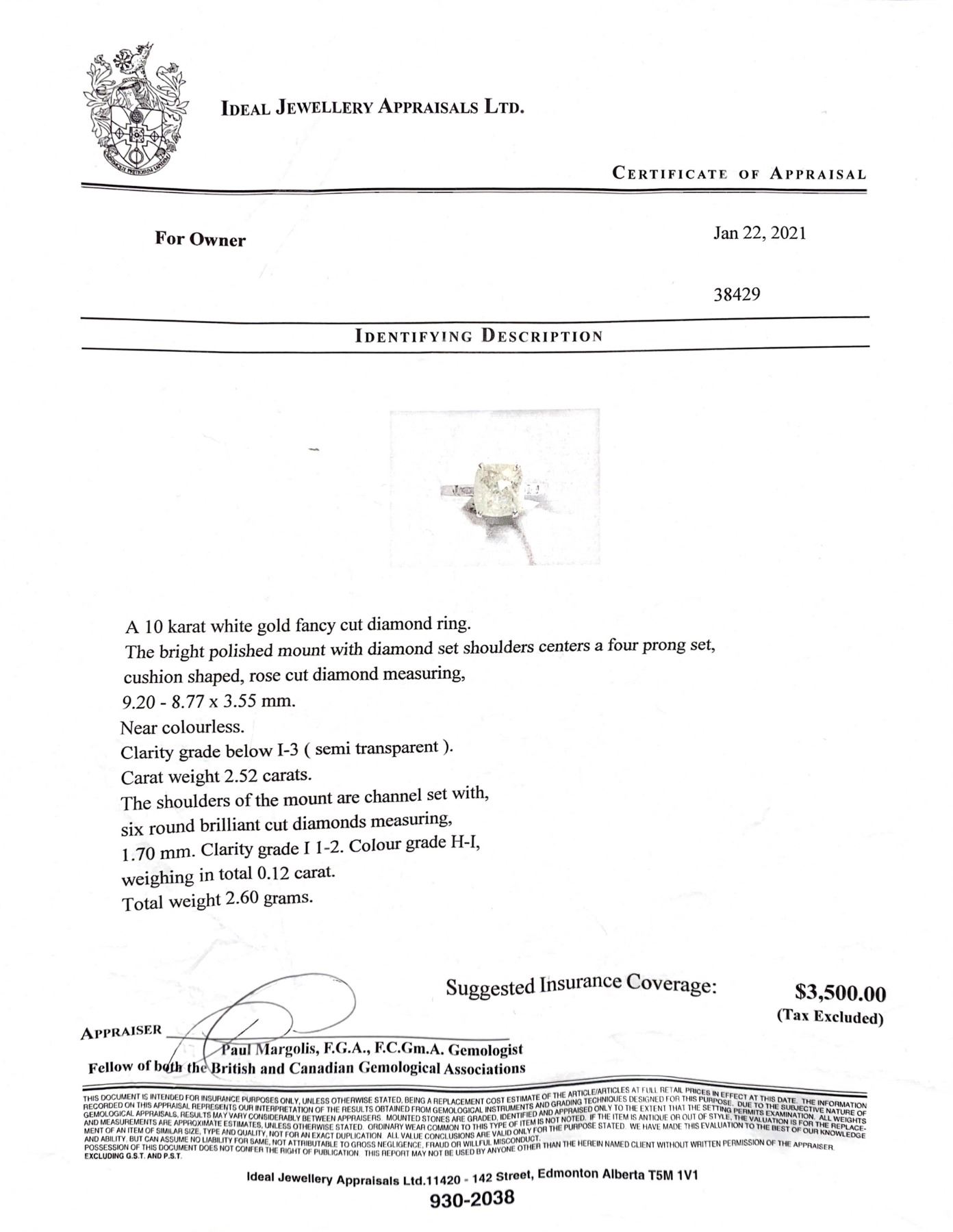 SIZE 6.25 A 10 KARAT WHITE GOLD FANCY CUT DIAMOND RING. THE BRIGHT POLISHED MOUNT WITH DIAMOND SET SHOULDERS CENTERS A FOUR PRONG SET, CUSHION SHAPED, ROSE CUT DIAMOND MEASURING,9.20- 8.77 X 3.55 MM. NEAR COLOURLESS. CLARITY GRADE BELOW -3 (SEMI TRANSPARENT ). CARAT WEIGHT 2.52 CARATS. THE SHOULDERS OF THE MOUNT ARE CHANNEL SET WITH,SIX ROUND BRILLIANT CUT DIAMONDS MEASURING. 1.70 MM. CLARITY GRADE I 1-2. COLOUR GRADE H-1, WEIGHING IN TOTAL 0.12 CARAT. TOTAL WEIGHT 2.60 GRAMS. CERTIFICATE OF APPRAISAL FROM LOCAL APPRAISER,SUGGESTED INSURANCE COVERAGE $3500.00.