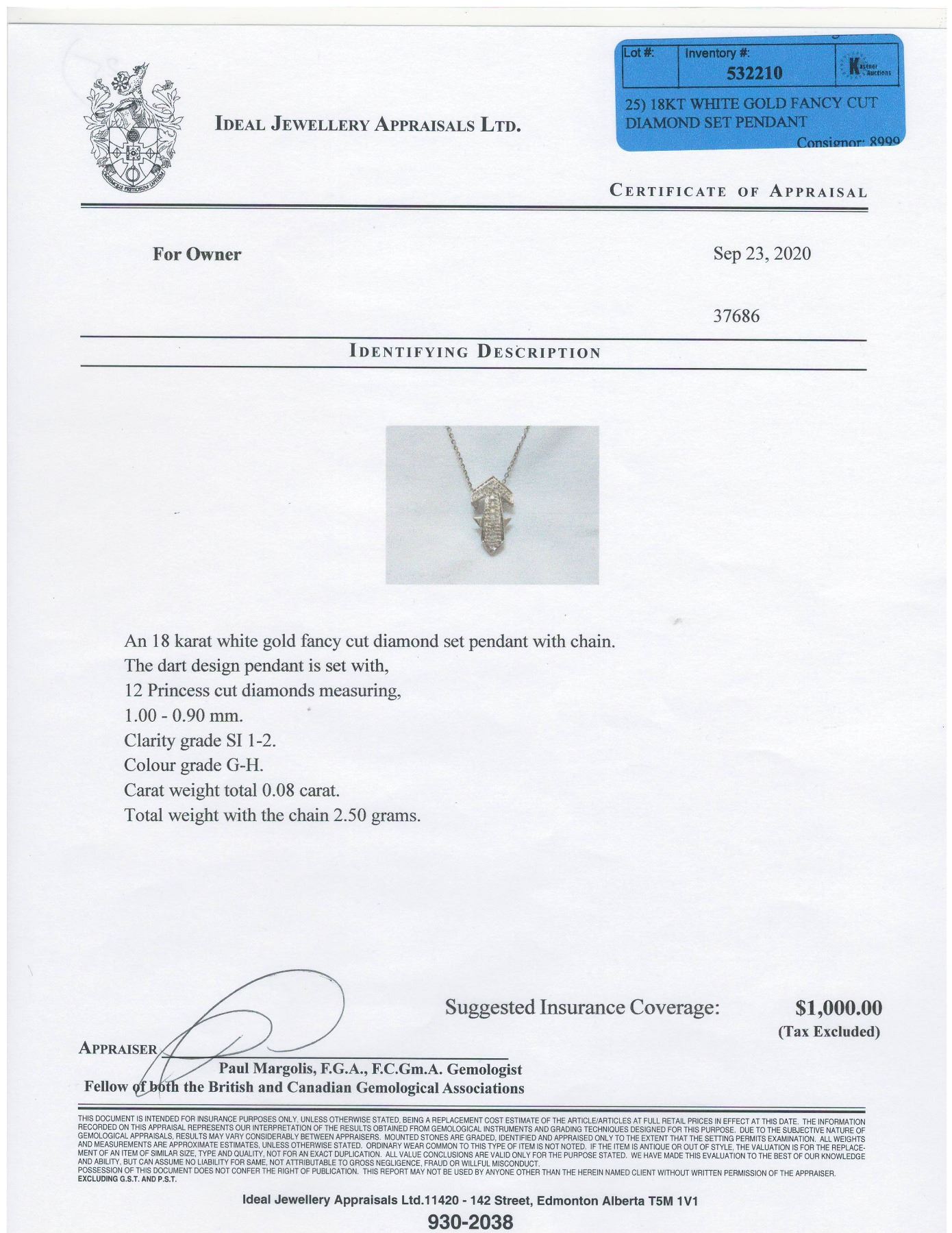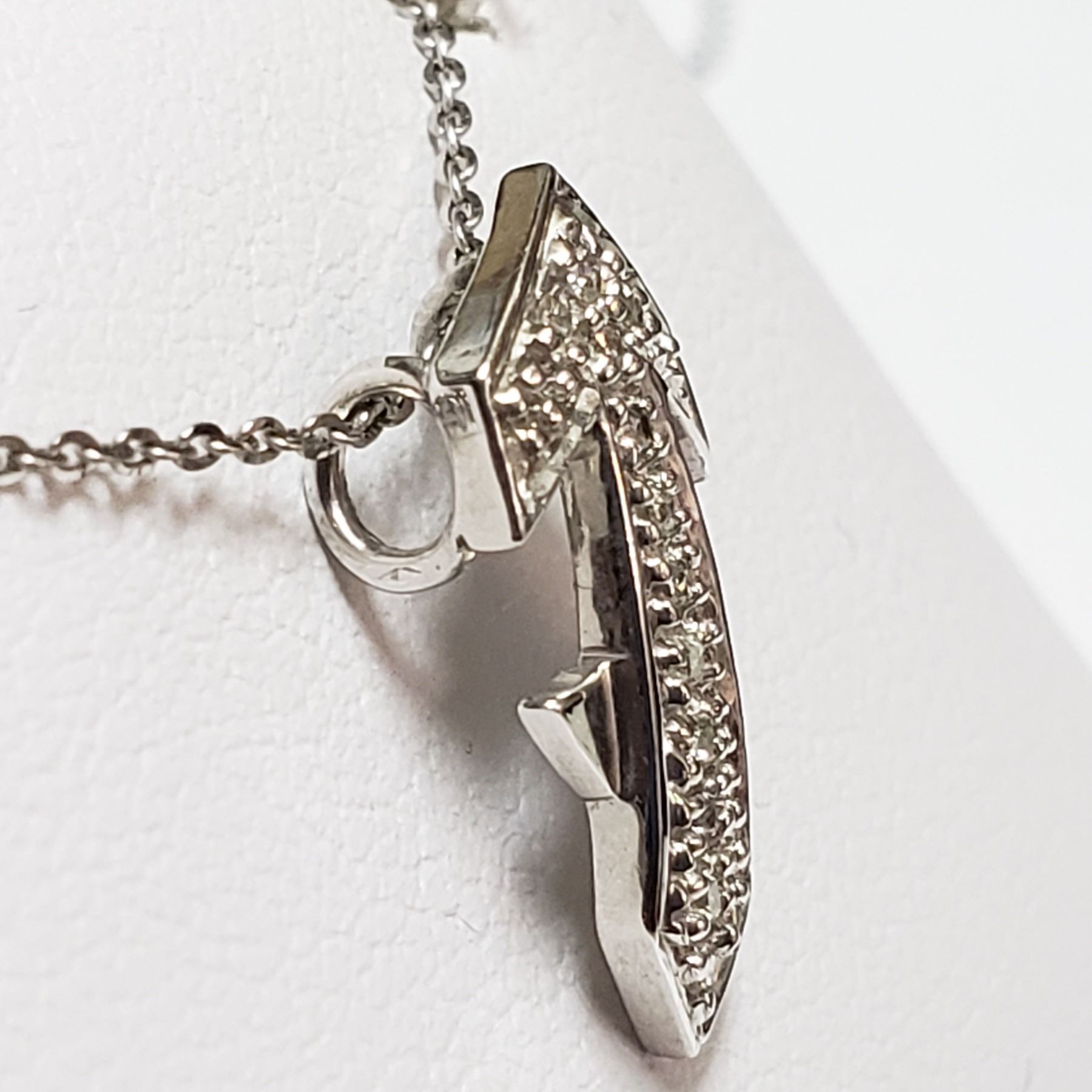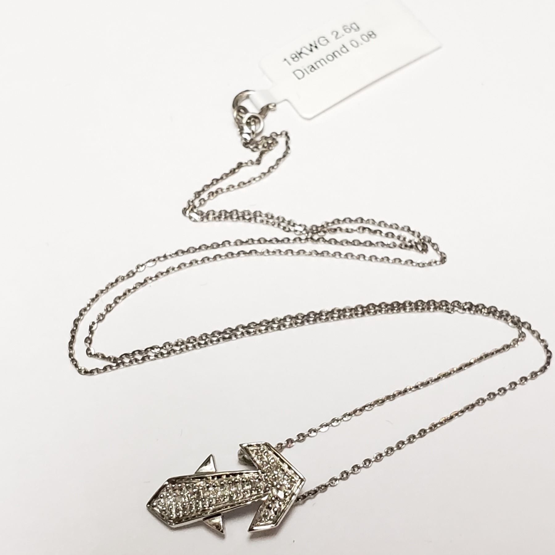 WITH CHAIN. THE DART DESIGN PENDANT IS SET WITH 12 PRINCESS CUT DIAMONDS (MEASURING 1.00-0.90 MM, CLARITY GRADE SI 1-2, COLOUR GRADE G-H, CARAT WEIGHT TOTAL 0.08 CARAT) COMES WITH CERTIFICATE OF APPRAISAL FROM LOCALAPPRAISER,SUGGESTED INSURANCE COVERAGE $1000.00. JEWELLERY