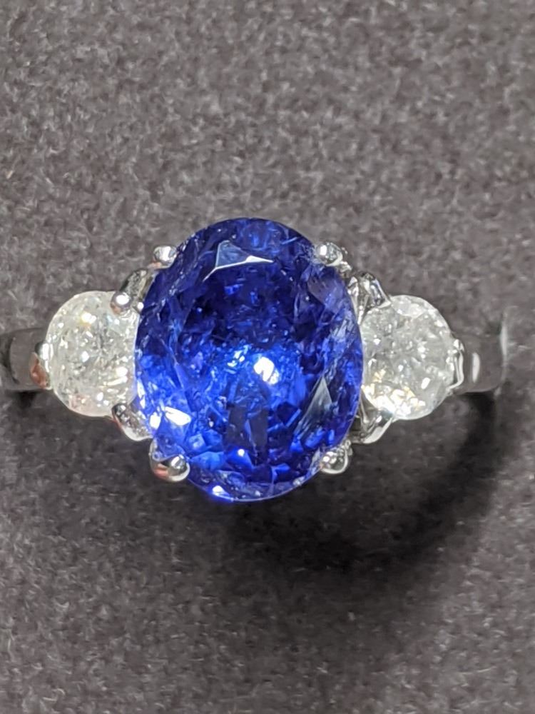 SIZE 7. OVAL SHAPED NATURAL TANZANITE (MEASURING 10.12 - 8.15 X 5.50MM, TONE MEDIUM, HUE VIOLET/BLUE, CLARITY GRADE I-2, CLARITY ENHANCED, WEIGHS 3.00 CARATS) SET WITH TWO ROUND BRILLIANT CUT DIAMONDS (MEASURING 4.48 AND 4.51MM, CLARITYGRADE I-3, COLOUR GRADE G-H, WEIGHS 0.84 CARATS). COMES WITH CERTIFICATE OF APPRAISAL FROM LOCAL APPRAISER. SUGGESTED INSURANCE COVERAGE $3,000.00. JEWELLERY