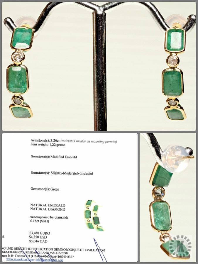 14K YELLOW GOLD EMERALD (3.2CT) AND DIAMOND (0.18CT) EARRINGS - SUGGESTED REPLACEMENT VALUE $5,046.00
