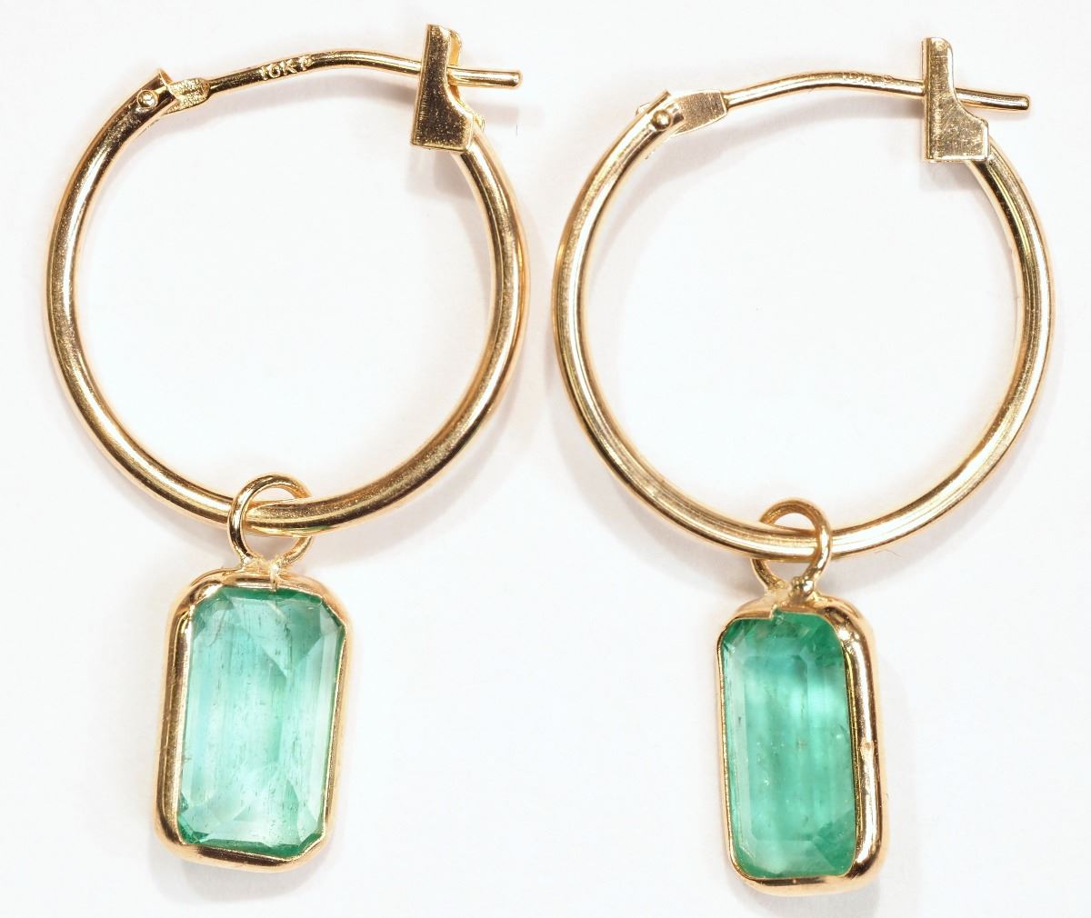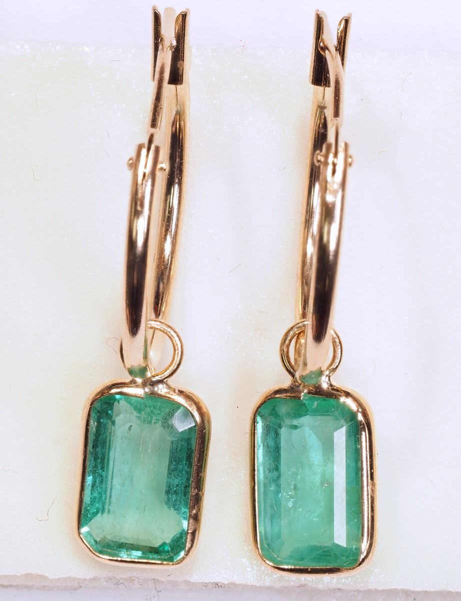 14K YELLOW GOLD EMERALD (3.6CT) HOOP EARRINGS SUGGESTED REPLACEMENT VALUE $1,900.00