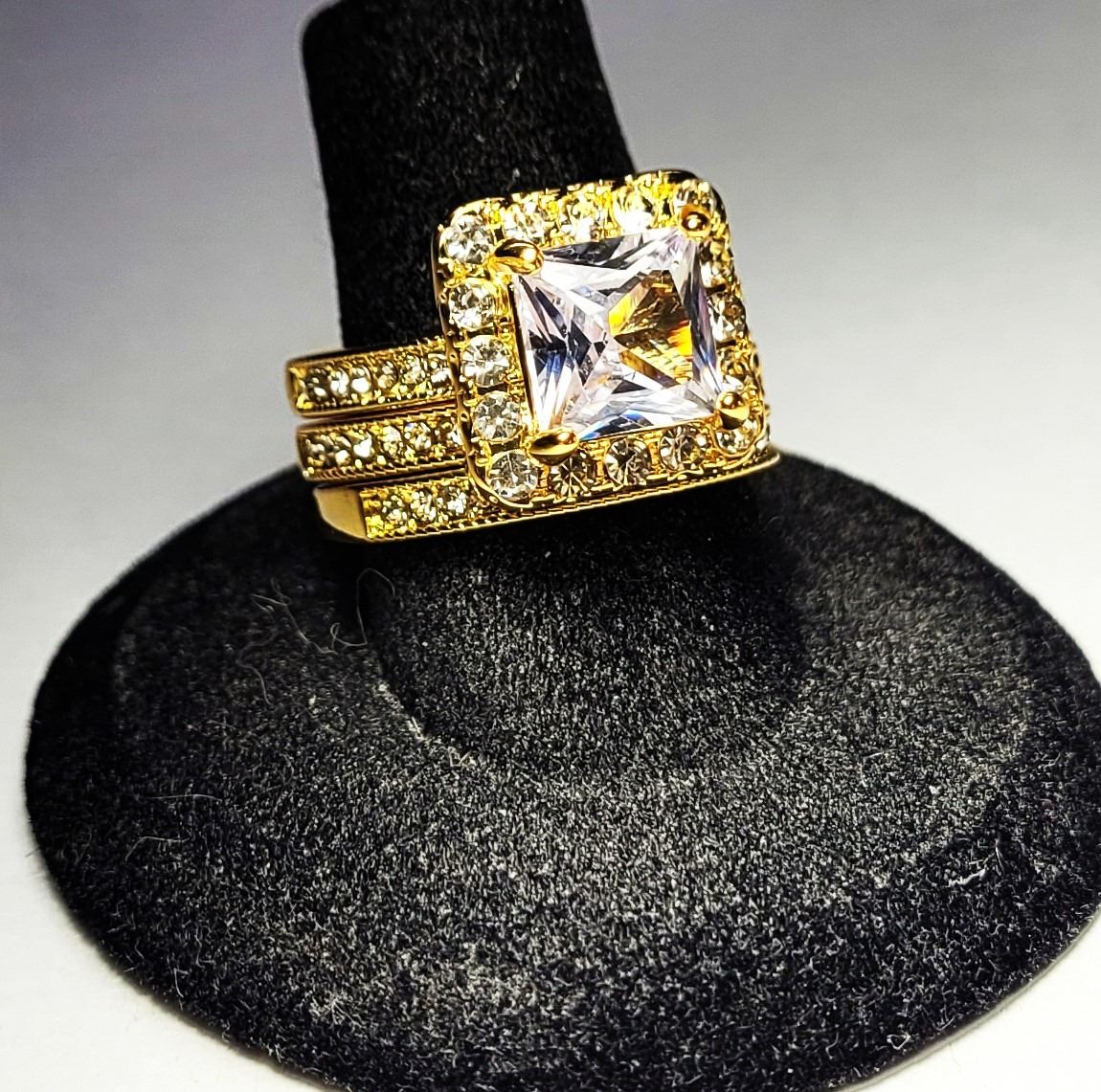 OF SQUARE HALO SETTING WITH 2 GUARD RING THAT ARE CHANNEL SET CLEAR CRYSTALS TO FORM 1/2 ETERNITY RINGS, SIZE 7.5. JEWELERY