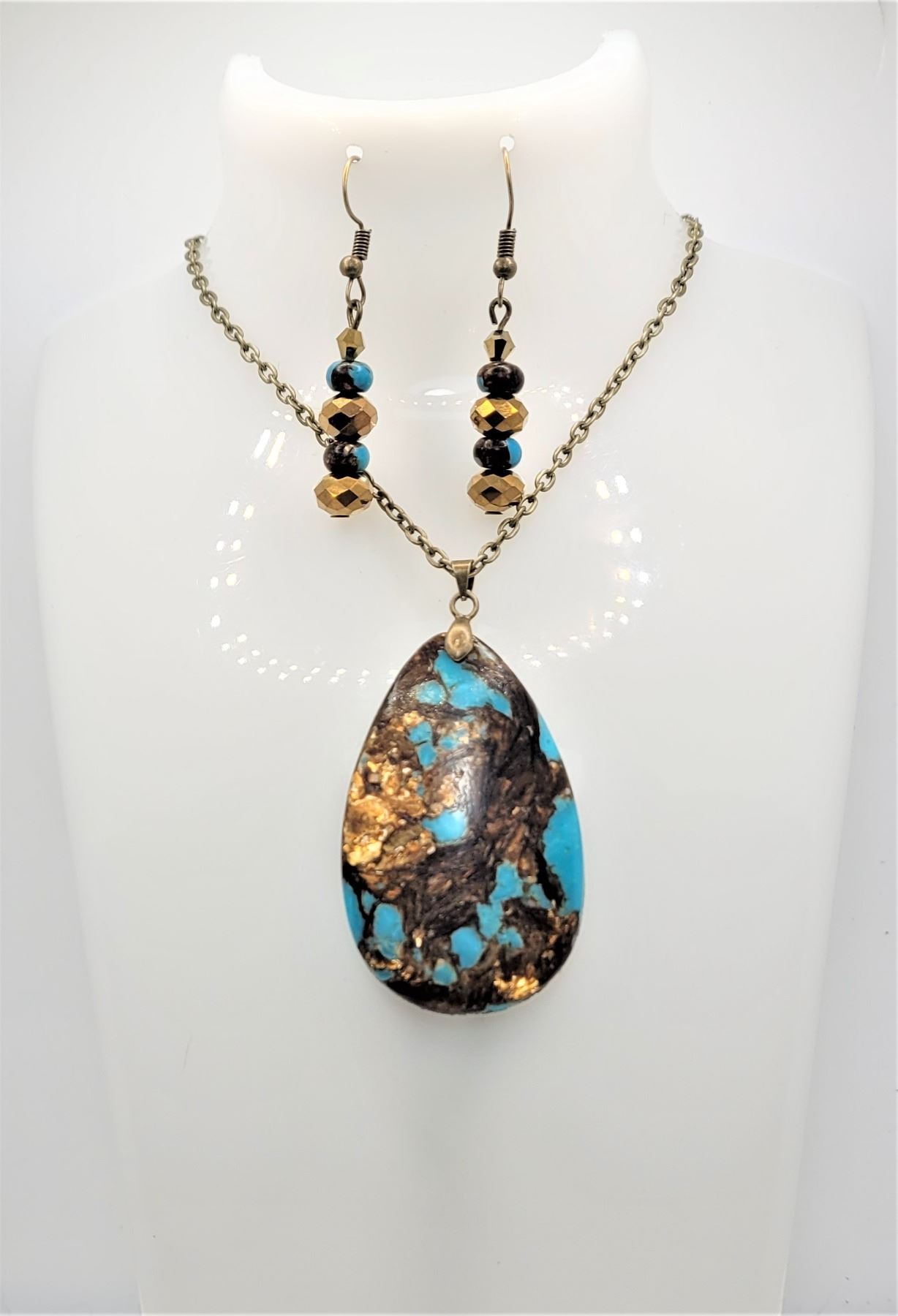 PENDANT ON 22" CHAIN AND COORDINATING DROP EARRINGS ON NICKLE FREE WIRES. JEWELRY