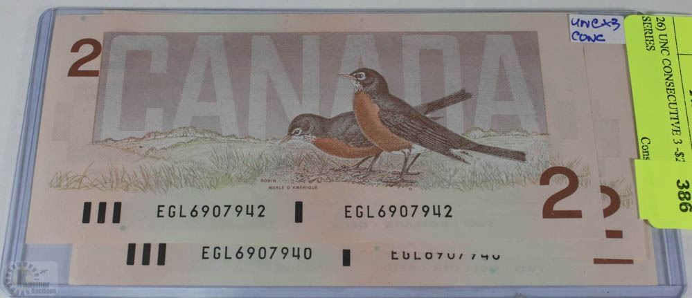 3 CONSECUTIVE SERIAL #'S EGL6907940,1,2 CANADIAN $2 BILLS 1986 THIESSEN CROW