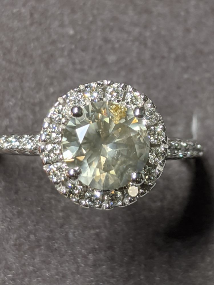 ROUND BRILLIANT CUT DIAMOND (MEASURING 6.88 - 6.91MM, CLARITY GRADE I-3, COLOUR GRADE M, CUT GRADE GOOD, WEIGHS 1.17 CARATS) SURROUNDED WITH 30 ROUND DIAMONDS (MEASURING 1.10 - 1.40MM, CLARITY GRADE SI-2 - I-1, COLOUR GRADE G-H, WEIGHS 0.33CARATS). COMES WITH CERTIFICATE OF APPRAISAL FROM LOCAL APPRAISER. SUGGESTED INSURANCE COVERAGE $5,500.00. JEWELLERY