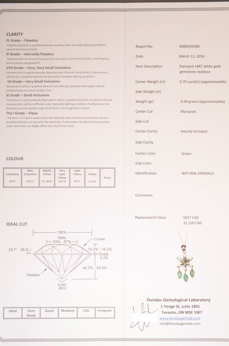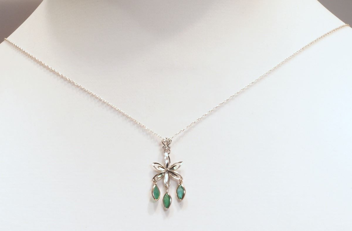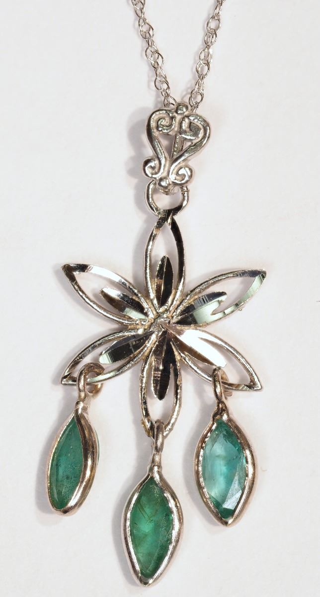 14K WHITE GOLD EMERALD (0.70CT) FLOWER NECKLACE SUGGESTED REPLACEMENT VALUE $1100