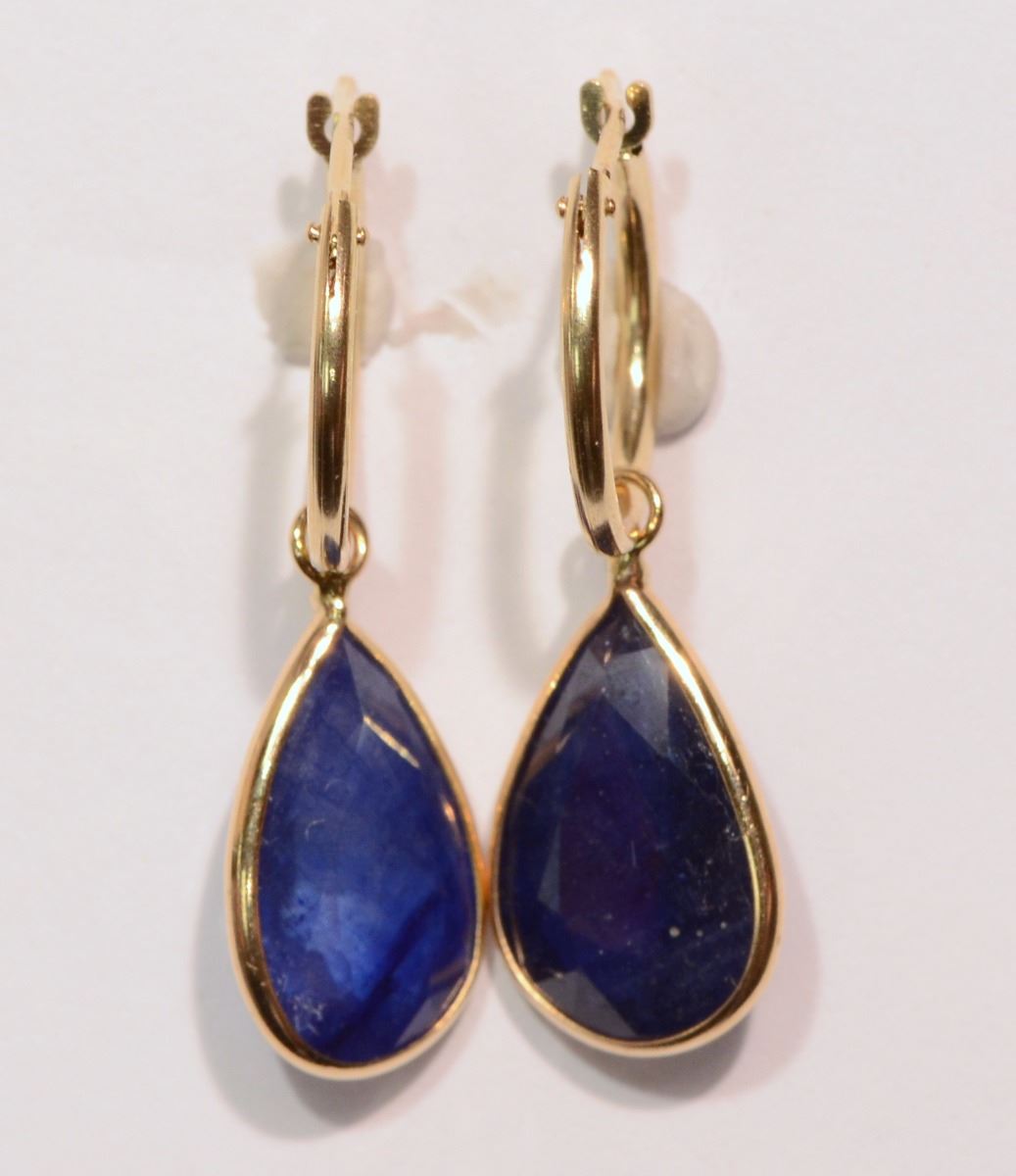 YELLOW GOLD HOOP EARRINGS WITH 2 SAPPHIRES (11.4CT) IN A DANGLING BEZEL SETTING