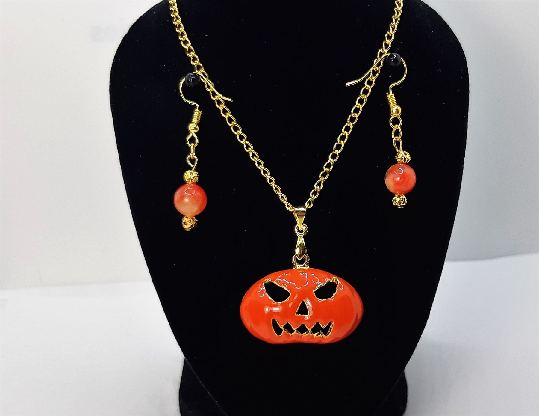 JACK-O-LANTERN PENDANT ON 24" CHAIN WITH ORANGE JADE DROP EARRINGS. JEWELRY