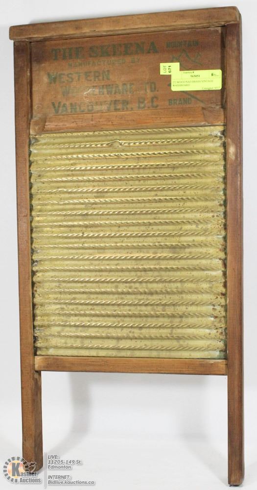 27) WOOD AND BRASS VINTAGE WASHBOARD