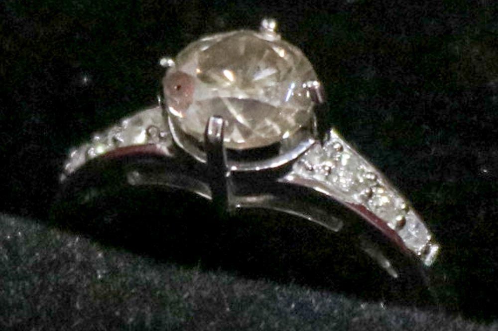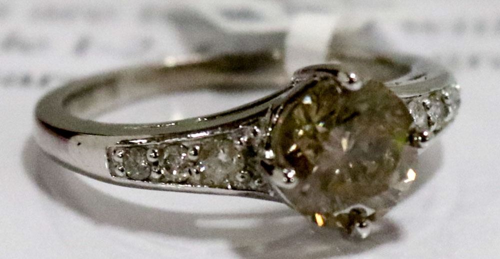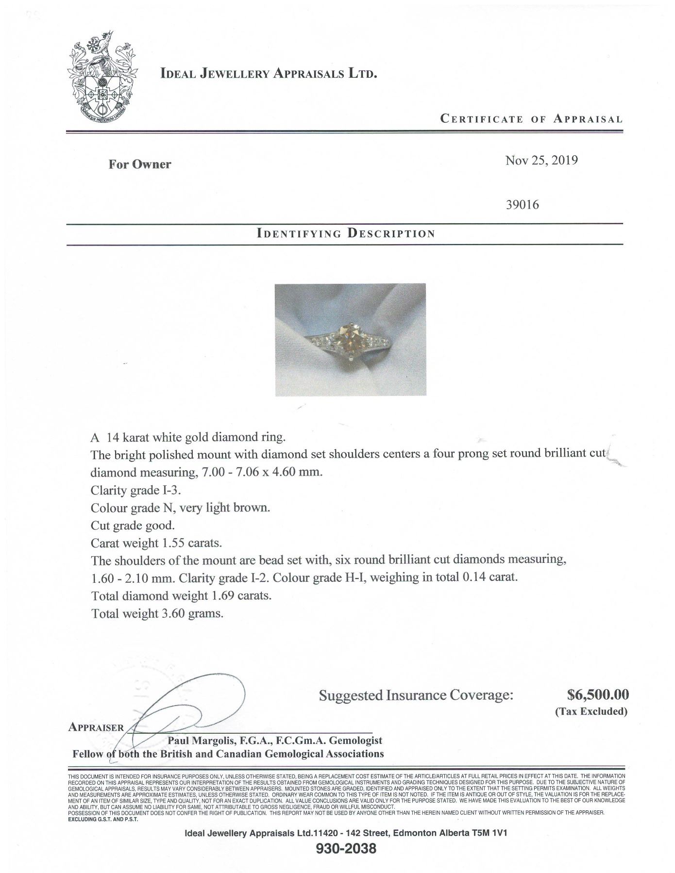 SIZE 6.75 WITH LOCAL APPRAISAL, ONE ROUND BRILLIANT CUT DIAMOND, CLARITY GRADE I-3, COLOR GRADE N (VERY LIGHT BROWN), CUT GRADE GOOD, CARAT WEIGHT 1.55 CARATS, SHOULDERS HAVE 6 ROUND BRILLIANT CUT DIAMONDS, CLARITY GRADE I-2, COLOR GRADE H-I, CARAT WEIGHT 0.14 CARATS, TOTAL DIAMOND WEIGHT 1.69 CARATS, TOTAL WEIGHT 3.60 GRAMS. SUGGESTED INSURANCE COVERAGE $6,500.00. JEWELLERY