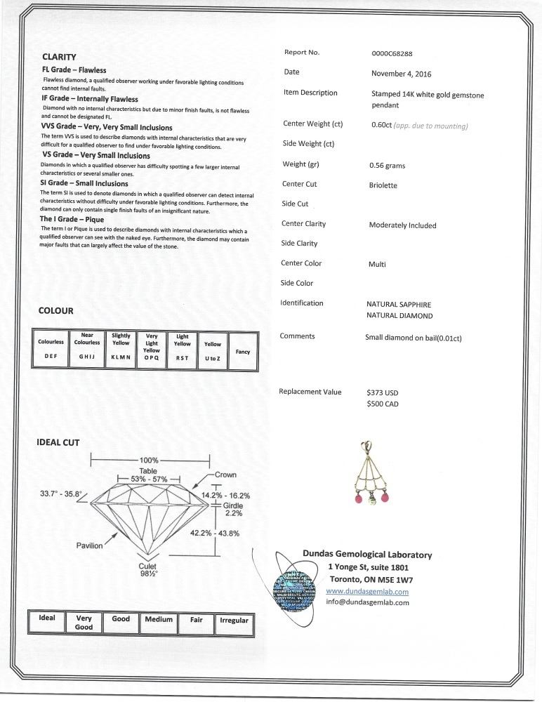 DIAMOND PENDANT. W/ COA -SUGGESTED REPLACEMENT VALUE $500.00