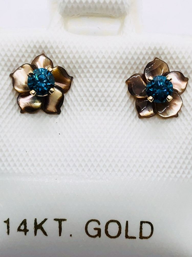 78 - JP263 - 14K YELLOW GOLD BLUE DIAMOND (0.16CTS) EARRINGS, MADE IN CANADA. JEWELLERY