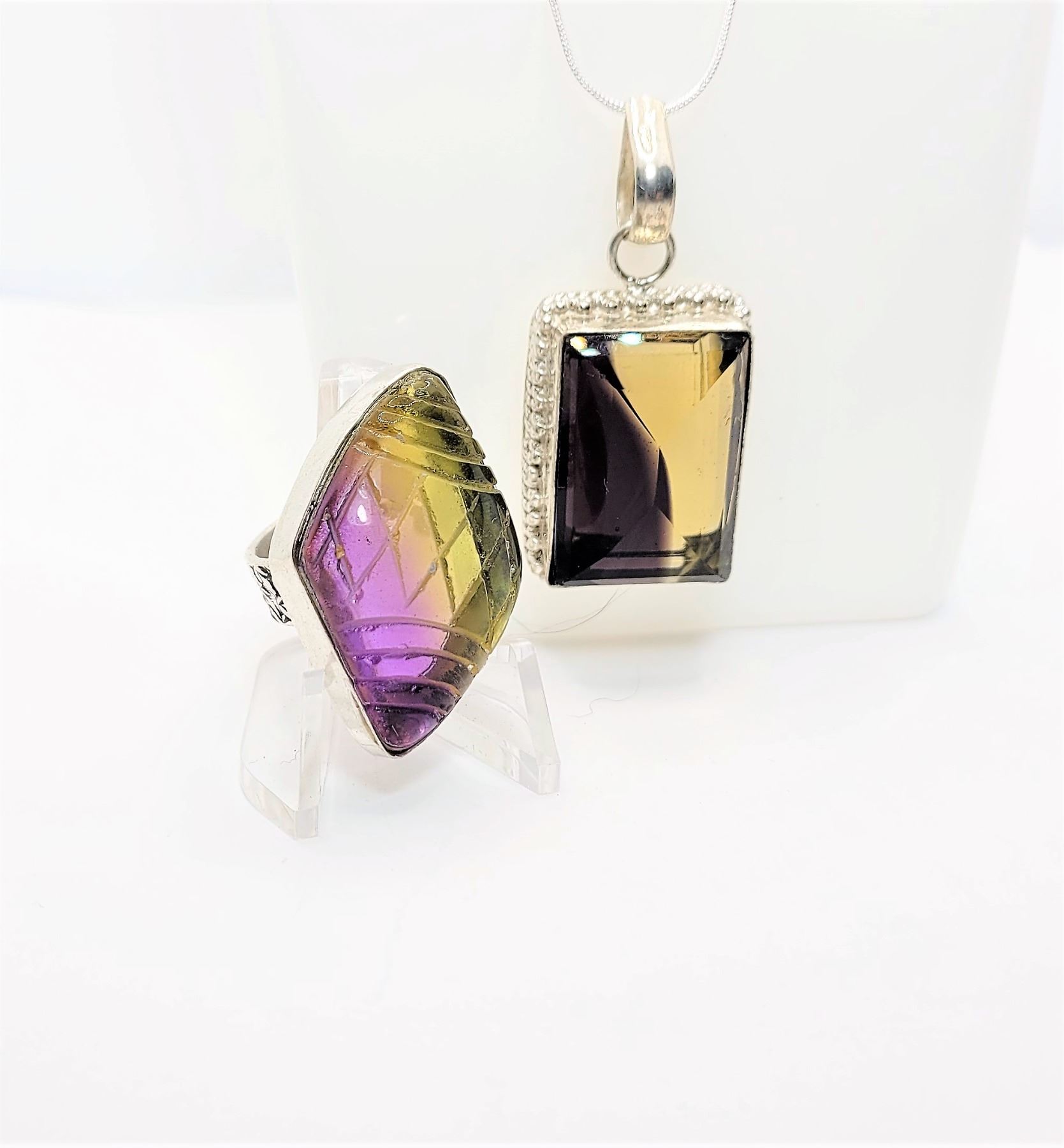 GEMSTONE PENDANT ON 18" CHAIN AND SIZE 7.5 RING WITH HEAVILY CARVED SHANK STAMPED 925 SILVER. JEWELRY