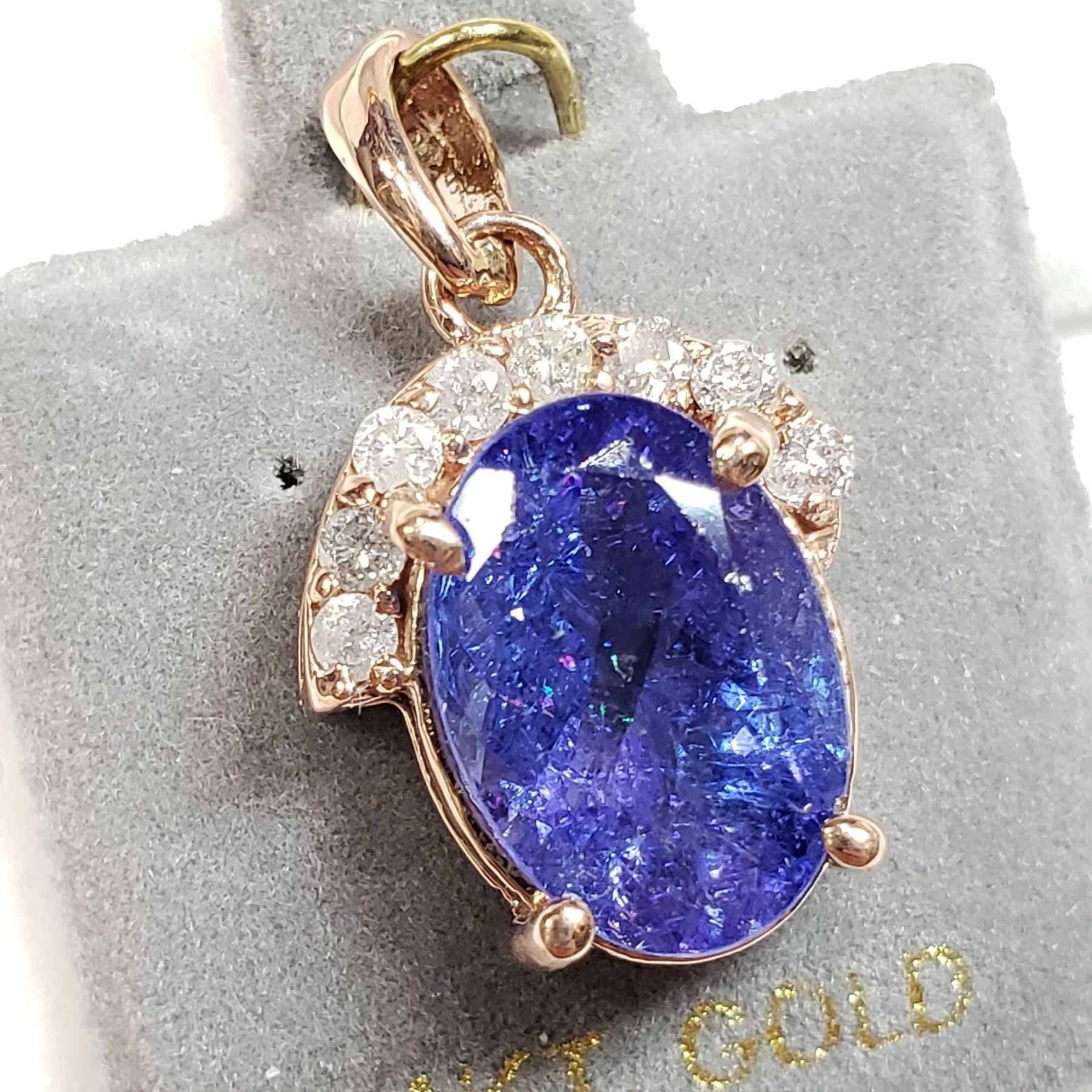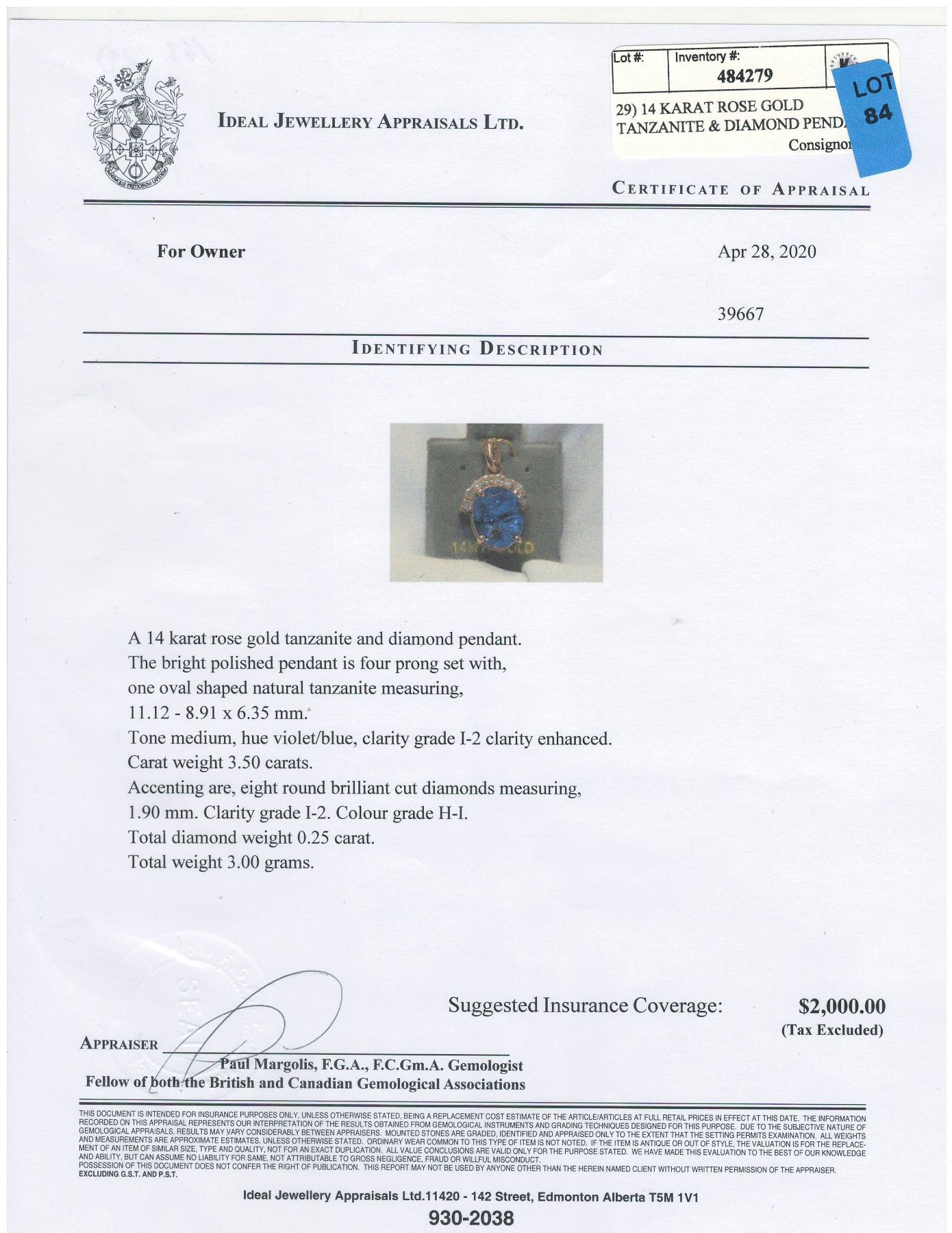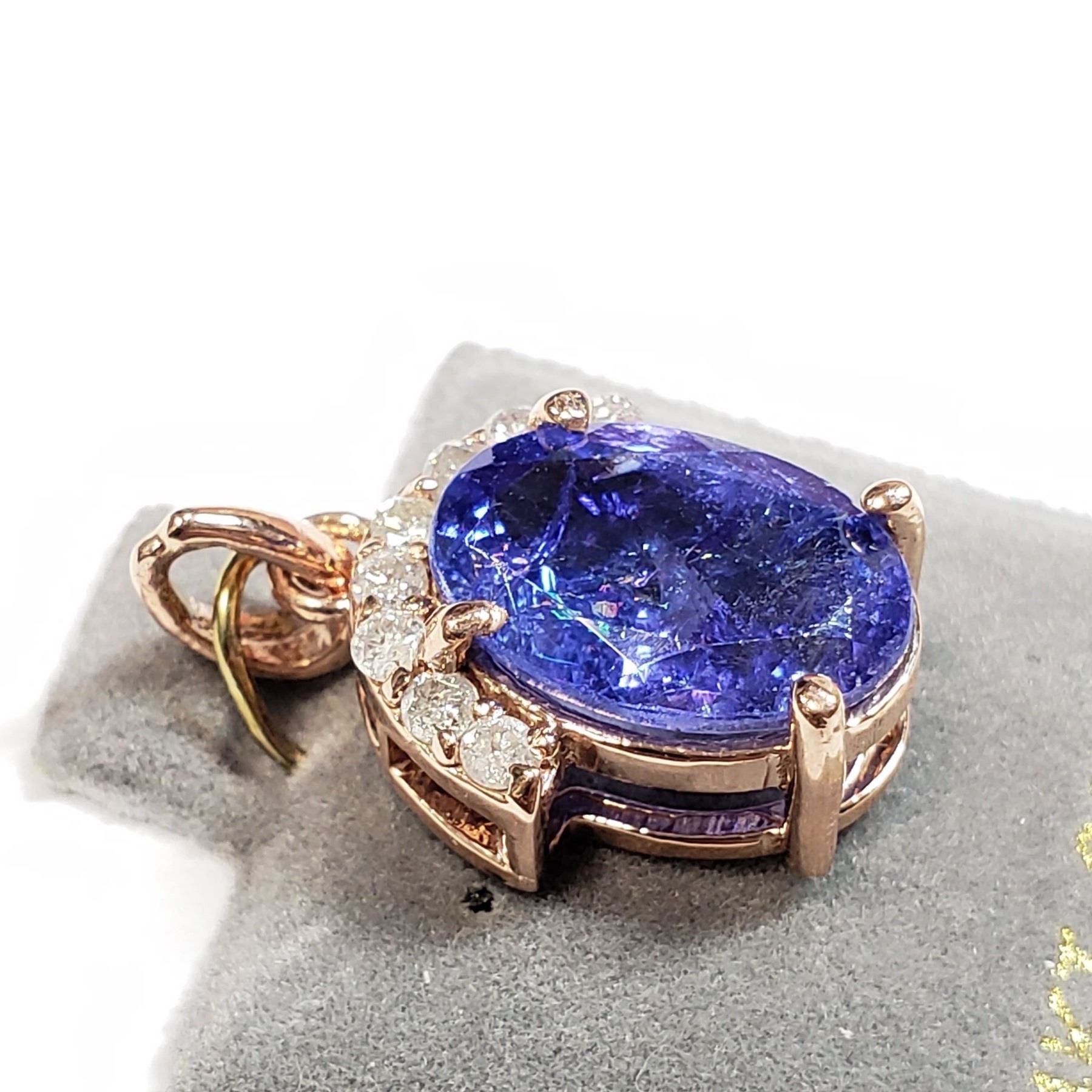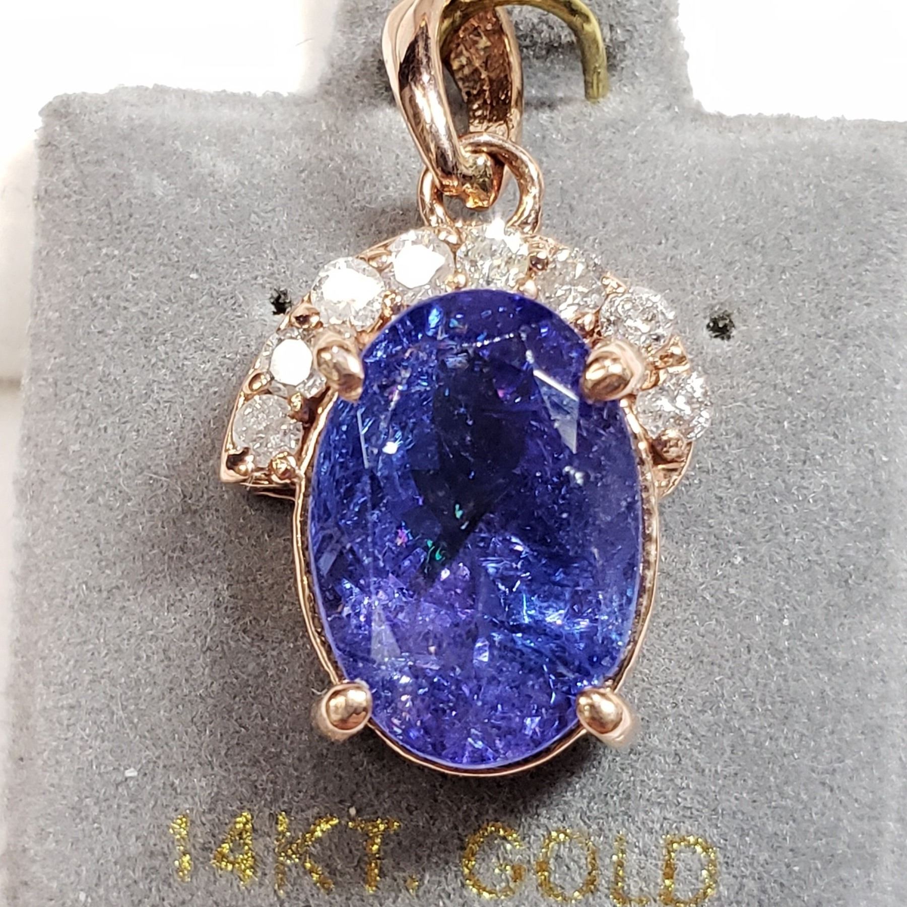 OVAL SHAPED TANZANITE (MEASURING 11.12 - 8.91 X 6.35MM, TONE MEDIUM, HUE VIOLET/BLUE, CLARITY GRADE I-2 CLARITY ENHANCED, WEIGHS 3.50 CARATS) ACCENTED BY EIGHT ROUND BRILLIANT CUT DIAMONDS (MEASURING 1.90MM, CLARITY GRADE I-2, COLOUR GRADE H-I, WEIGHT 0.25 CARAT). COMES WITH CERTIFICATE OF APPRAISAL FROM LOCAL APPRAISER. SUGGESTED INSURANCE COVERAGE $2,000.00. JEWELLERY