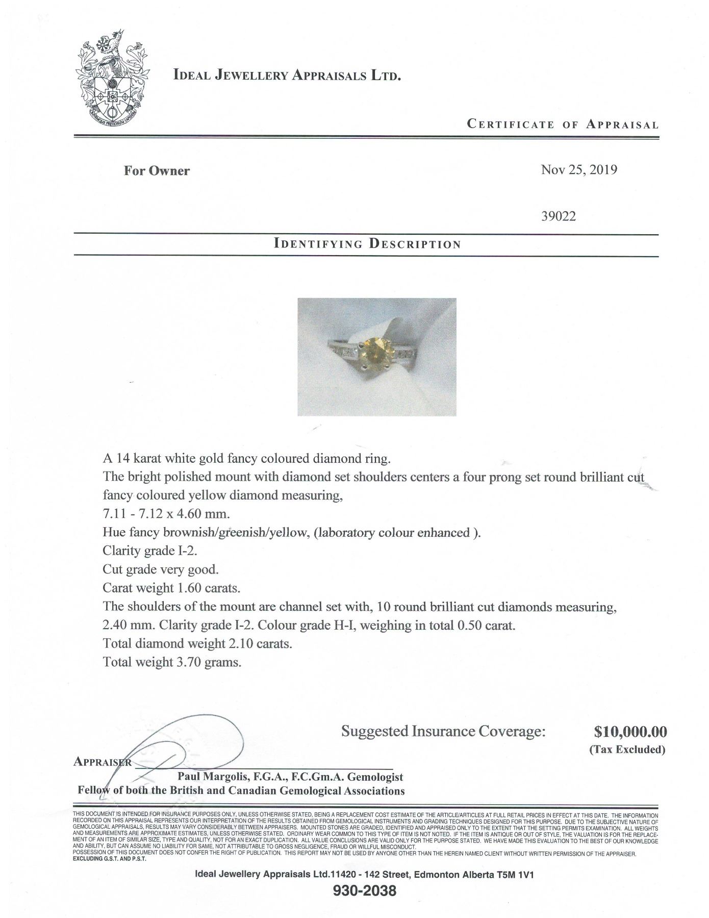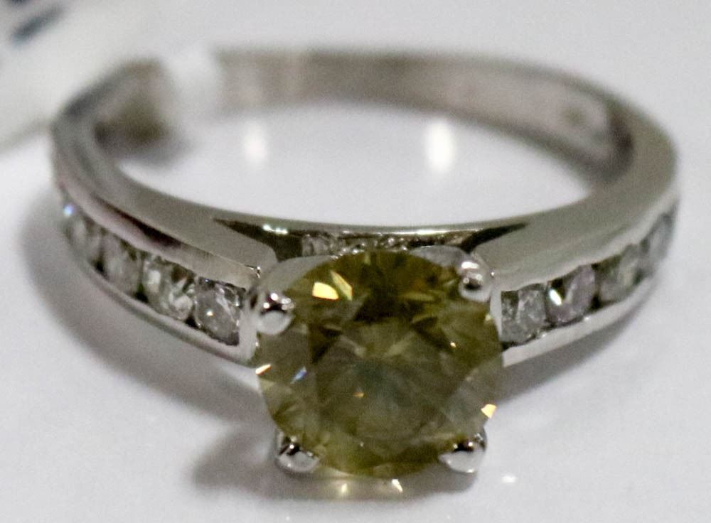 SIZE 6.75 WITH LOCAL APPRAISAL, ROUND BRILLIANT CUT FANCY COLORED YELLOW DIAMOND, CLARITY I-2, CUT GRADE VERY GOOD, CARAT WEIGHT 1.60 CARATS, 10 ROUND BRILLIANT CUT DIAMONDS, CLARITY GRADE I-2, COLOR GRADE H-I, CARAT WEIGHT 0.50 CARATS, TOTAL DIAMOND WEIGHT 2.10 CARATS, TOTAL WEIGHT 3.70 GRAMS. SUGGESTED INSURANCE COVERAGE $10,000.00. JEWELLERY