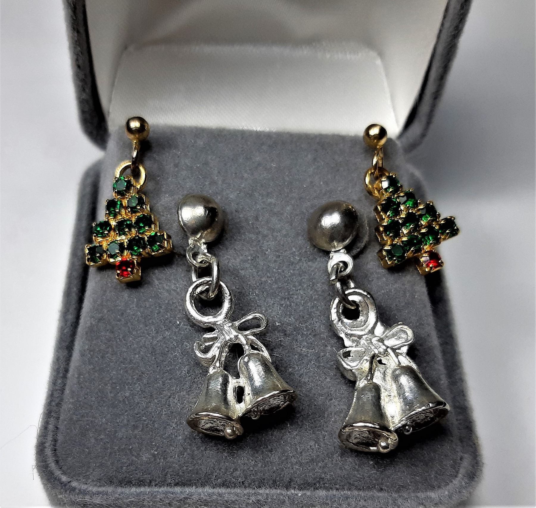 GOLD TONE XMAS TREE WITH RED & GREEN CRYSTALS ON FISHHOOK WIRES & SILVER TONE BELLS ON STUDS. JEWELRY
