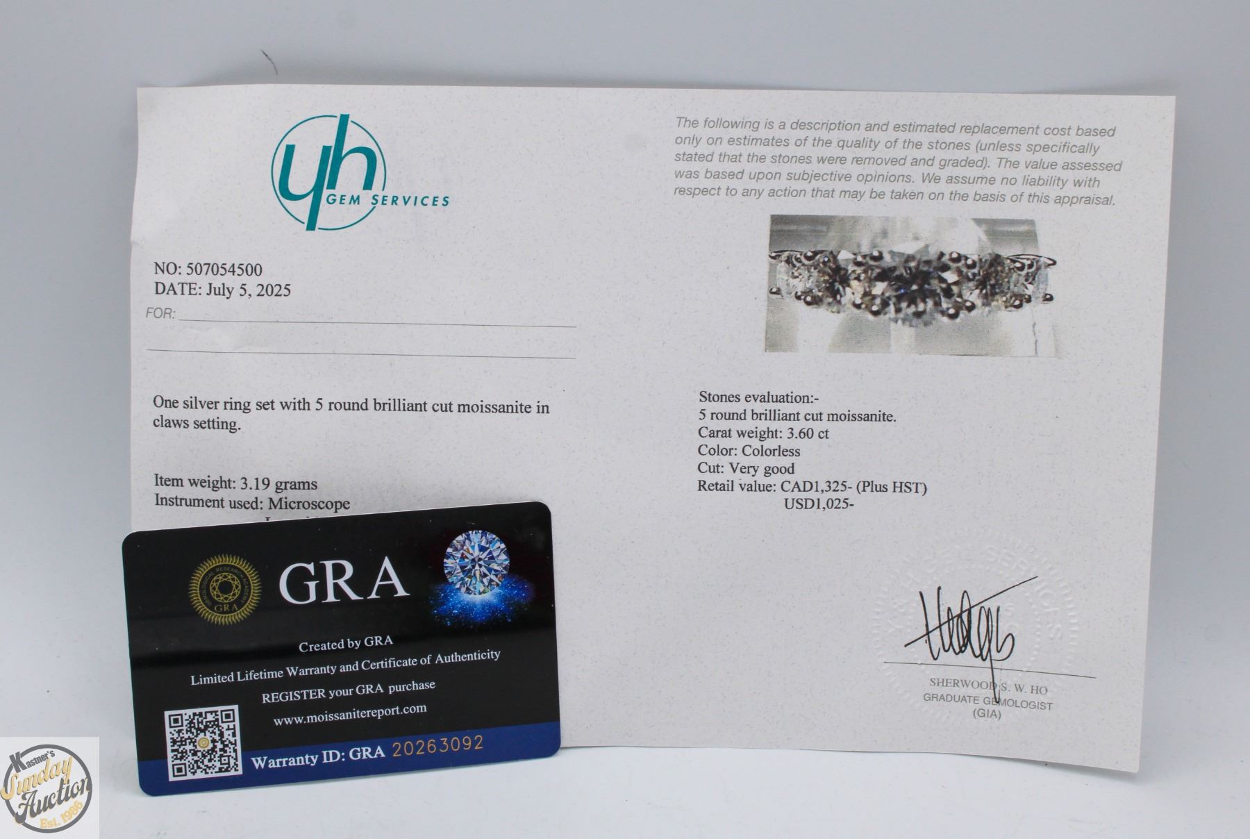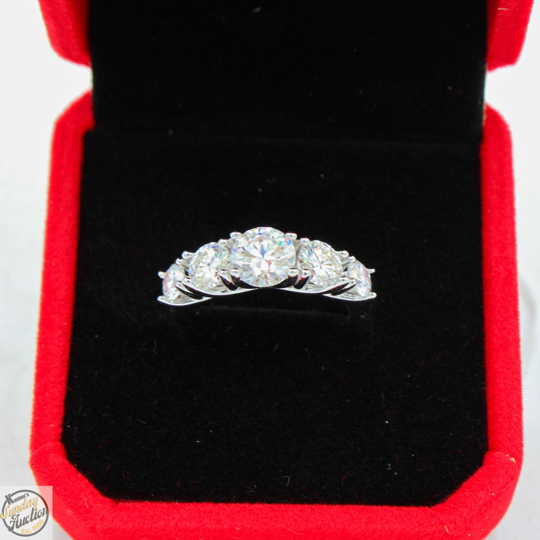 BRILLIANT CUT MOISSANITE STONES VVS D COLOR SET WITH LARGER MOISSANITE SET IN CENTER WITH GRADUATING DOWN IN SIZE ON EITHER SIDE SET IN 925 SILVER RING SIZE 6.5 RETAIL VALUE $1,325.00 **ALL ITEMS MUST BE REMOVED BY 5PM SATURDAY, DECEMBER 20TH 2025. ALL REMAINING ITEMS WILL BE SUBJECT TO A $6.00 PER DAY STORAGE CHARGE. ANY ITEMS REMAINING AFTER MONDAY, JANUARY 5TH 2026 WILL BE CONSIDERED FORFEITED. NO REFUNDS WILL BE ISSUED FOR FORFEITED ITEMS. TO SCHEDULE A PICK UP APPOINTMENT CLICK HERE