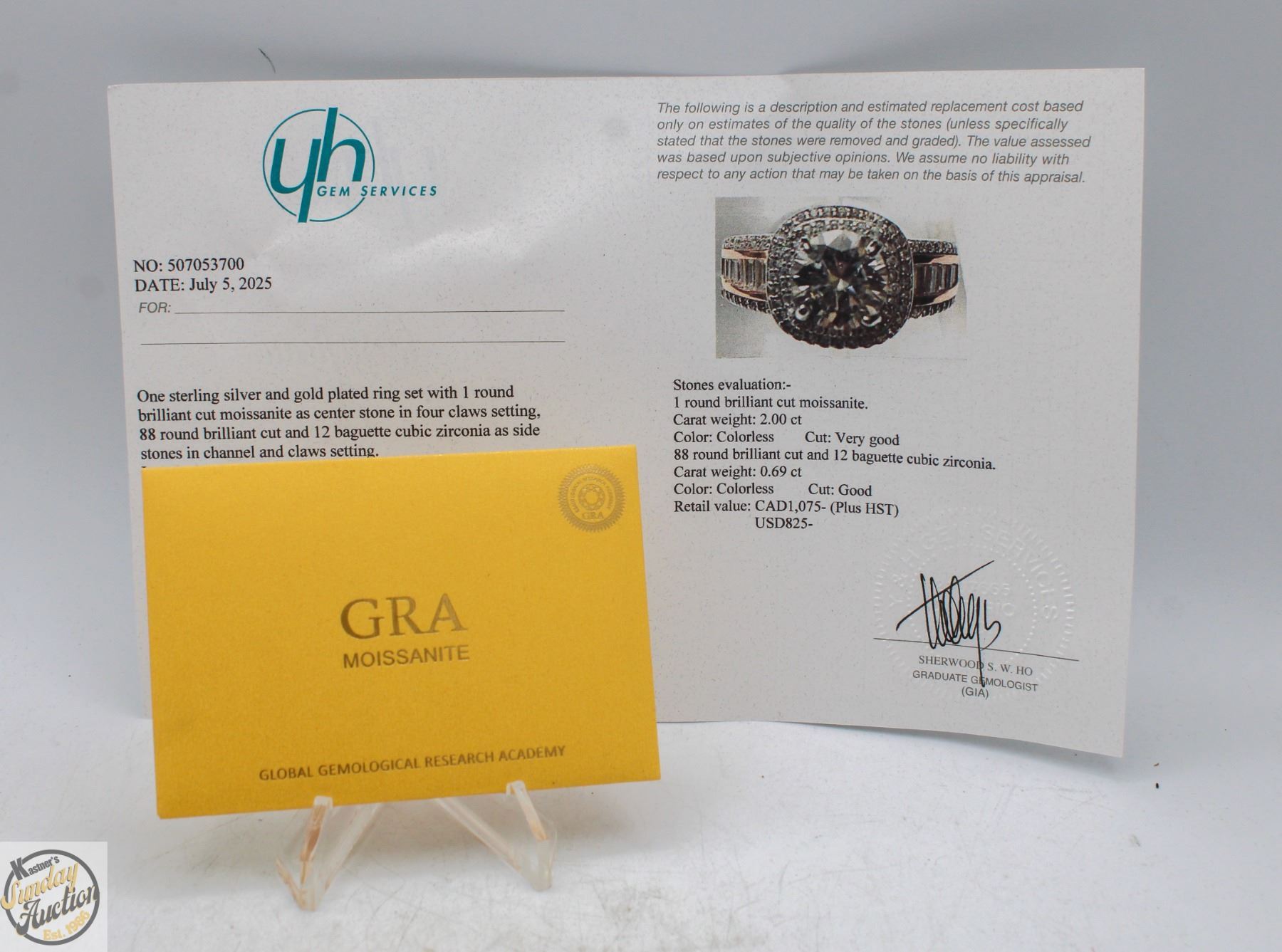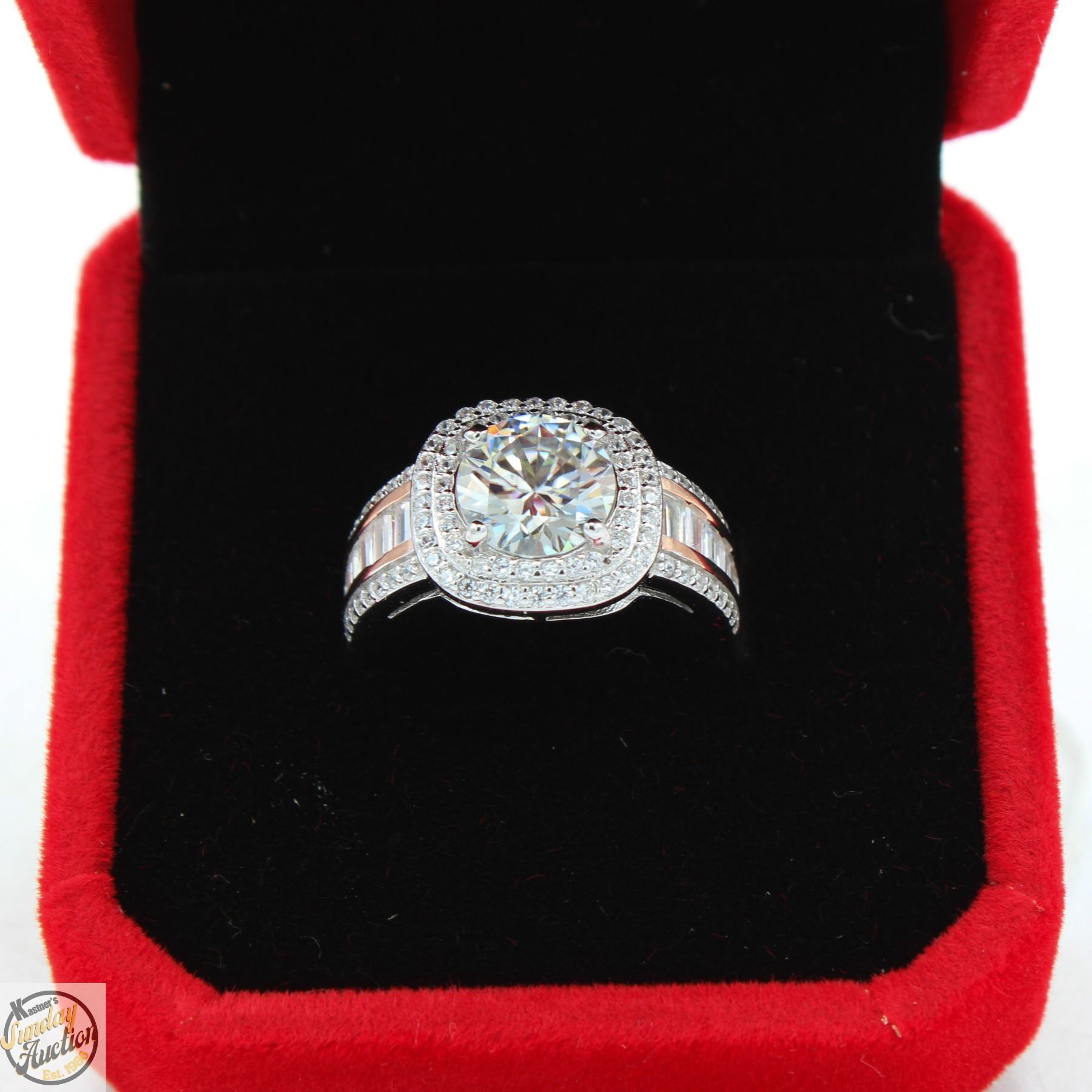 CUT MOISSANITE STONE VVS D COLOR WITH 88 ROUND BRILLIANT CUT CUBIC ZIRCONIA AND 12 BAGUETTE SHAPED CUBIC ZIRCONIA SET IN SHANKS SET IN 925 SILVER RING SIZE 6 RETAIL VALUE $1,075.00 **ALL ITEMS MUST BE REMOVED BY 5PM SATURDAY, AUGUST 9 2025. ALL REMAINING ITEMS WILL BE SUBJECT TO A $6.00 PER DAY STORAGE CHARGE. ANY ITEMS REMAINING AFTER MONDAY, AUGUST 25TH 2025 WILL BE CONSIDERED FORFEITED. NO REFUNDS WILL BE ISSUED FOR FORFEITED ITEMS. TO SCHEDULE A PICK UP APPOINTMENT CLICK HERE