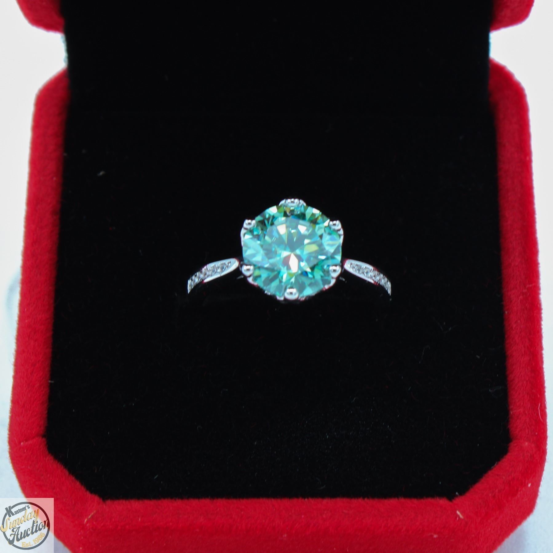 CUT MOISSANITE STONE VVS LIGHT BLUE COLOR SET IN CENTER WITH 12 ROUND BRILLIANT CUT CUBIC ZIRCONIA SET IN TAPERED SHANKS AND SET IN 925 SILVER RING SIZE 6 RETAIL VALUE $1,275.00 **ALL ITEMS MUST BE REMOVED BY 5PM SATURDAY, AUGUST 9 2025. ALL REMAINING ITEMS WILL BE SUBJECT TO A $6.00 PER DAY STORAGE CHARGE. ANY ITEMS REMAINING AFTER MONDAY, AUGUST 25TH 2025 WILL BE CONSIDERED FORFEITED. NO REFUNDS WILL BE ISSUED FOR FORFEITED ITEMS. TO SCHEDULE A PICK UP APPOINTMENT CLICK HERE