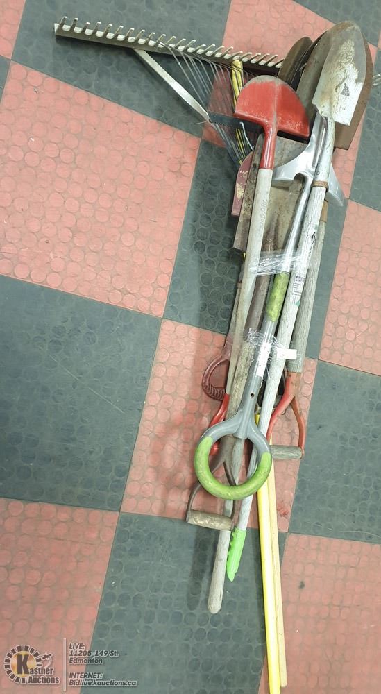 2GARDEN RAKES, 7SHOVEL, 1 EDGER SPADE, 1 WEED