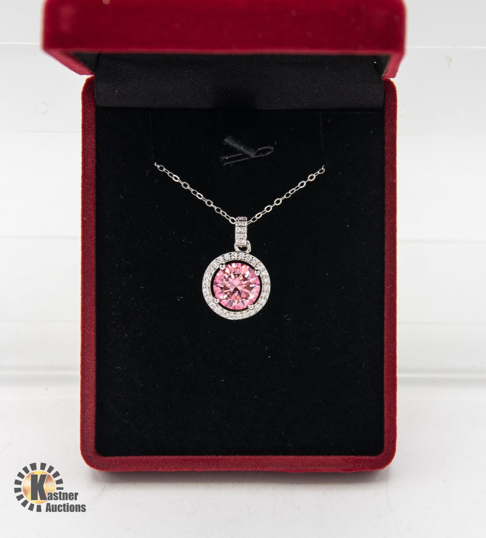 WITH HALO SURROUNDING PINK MOISSANITE WITH 36 ROUND CUBIC ZIRCONIUM WEIGHING AN APPROX. TOTAL 0.30 SET IN STERLING SILVER PENDANT AND NECKLACE **ALL ITEMS MUST BE REMOVED BY 5PM SATURDAY, MARCH 2ND 2024. ALL REMAINING ITEMS WILL BE SUBJECT TO A $6.00 PER DAY STORAGE CHARGE. ANY ITEMS REMAINING AFTER MONDAY, MARCH 18TH, 2023 WILL BE CONSIDERED FORFEITED. NO REFUNDS WILL BE ISSUED FOR FORFEITED ITEMS. TO SCHEDULE A PICK UP APPOINTMENT CLICK HERE