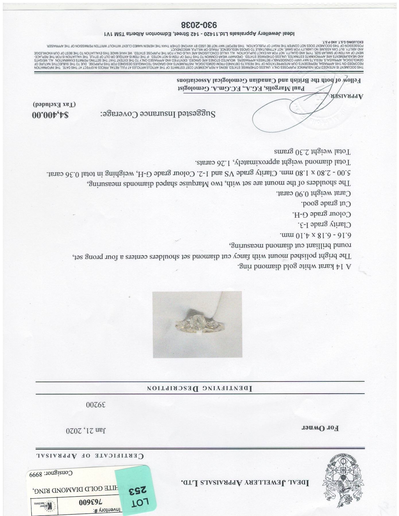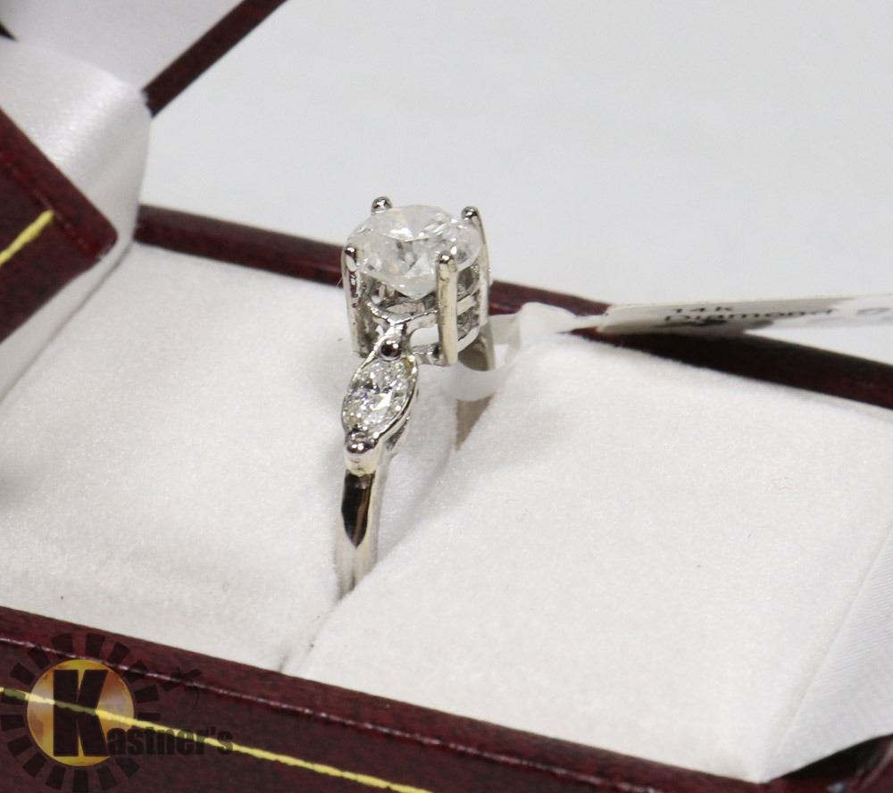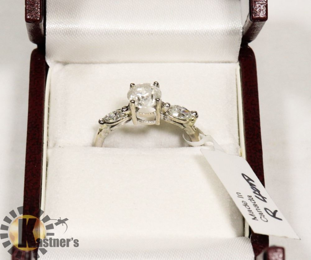 SIZE 6, ONE ROUND BRILLIANT CUT DIAMOND (MEASURING 6.16-6.18 X 4.10 MM, CLARITY GRADE I-3, COLOR GRADE G-H, CUT GRADE GOOD, CARAT WEIGHT 0.90), TWO MARQUISE SHAPED DIAMONDS (MEASURING 5.00-2.80 X 180 MM, CLARITY GRADE VS, COLOR GRADE G-H,WEIGHING TOTAL 0.36 CARATS), TOTAL DIAMOND WEIGHT APPROX 1.26 CARATS, COMES WITH CERTIFICATE OF APPRAISAL FROM LOCAL APPRAISER, SUGGESTED INSURANCE COVERAGE $4,400.00. JEWELLERY