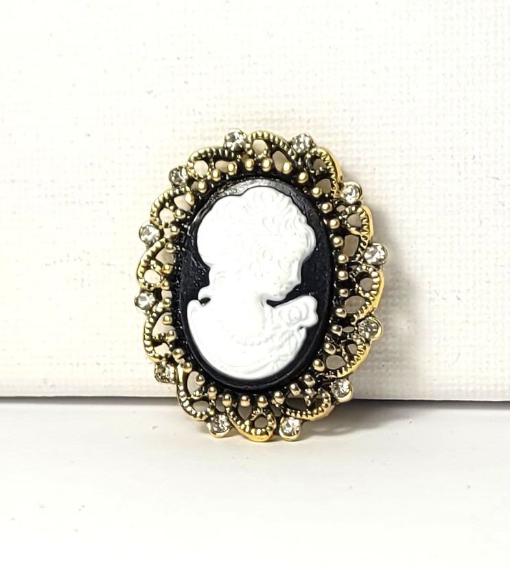AND WHITE OVAL CAMEO BROOCH WITH CLEAR CRYSTAL ACCENTS, 1.5" X 1.25". JEWELERY