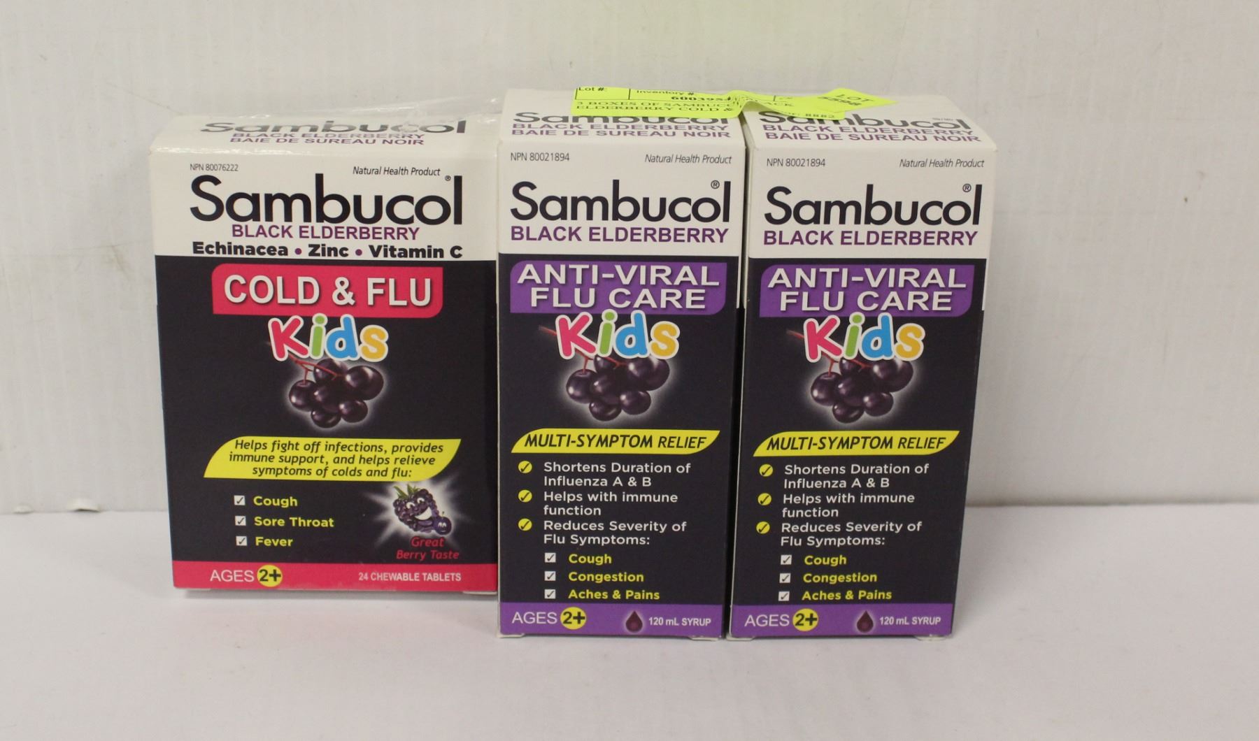 3 BOXES OF SAMBUCOL BLACK ELDERBERRY COLD & FLU MEDICINE FOR KIDS. AGES 2+. 2 X ANTI-VIRAL FLU CARE 120ML EXP 07/2023. 1 X COLD & FLU 24 CHEWABLE TABLETS EXP 04/2023