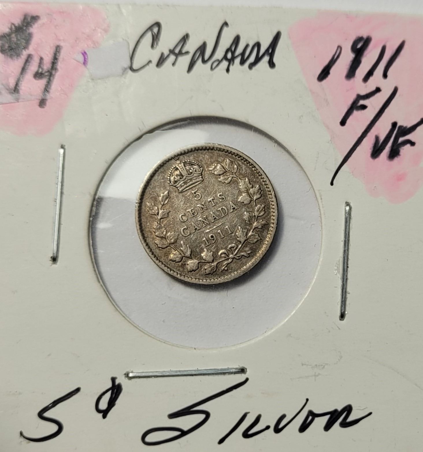 3) CANADIAN 1911 5 CENT COIN, 92.5 PURE SILVER.