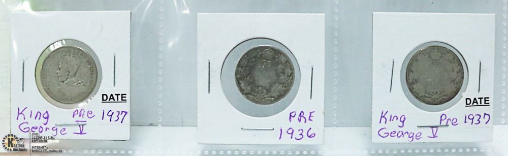 3 CANADIAN 1930'S 90% SILVER QUARTERS, GEO. V.