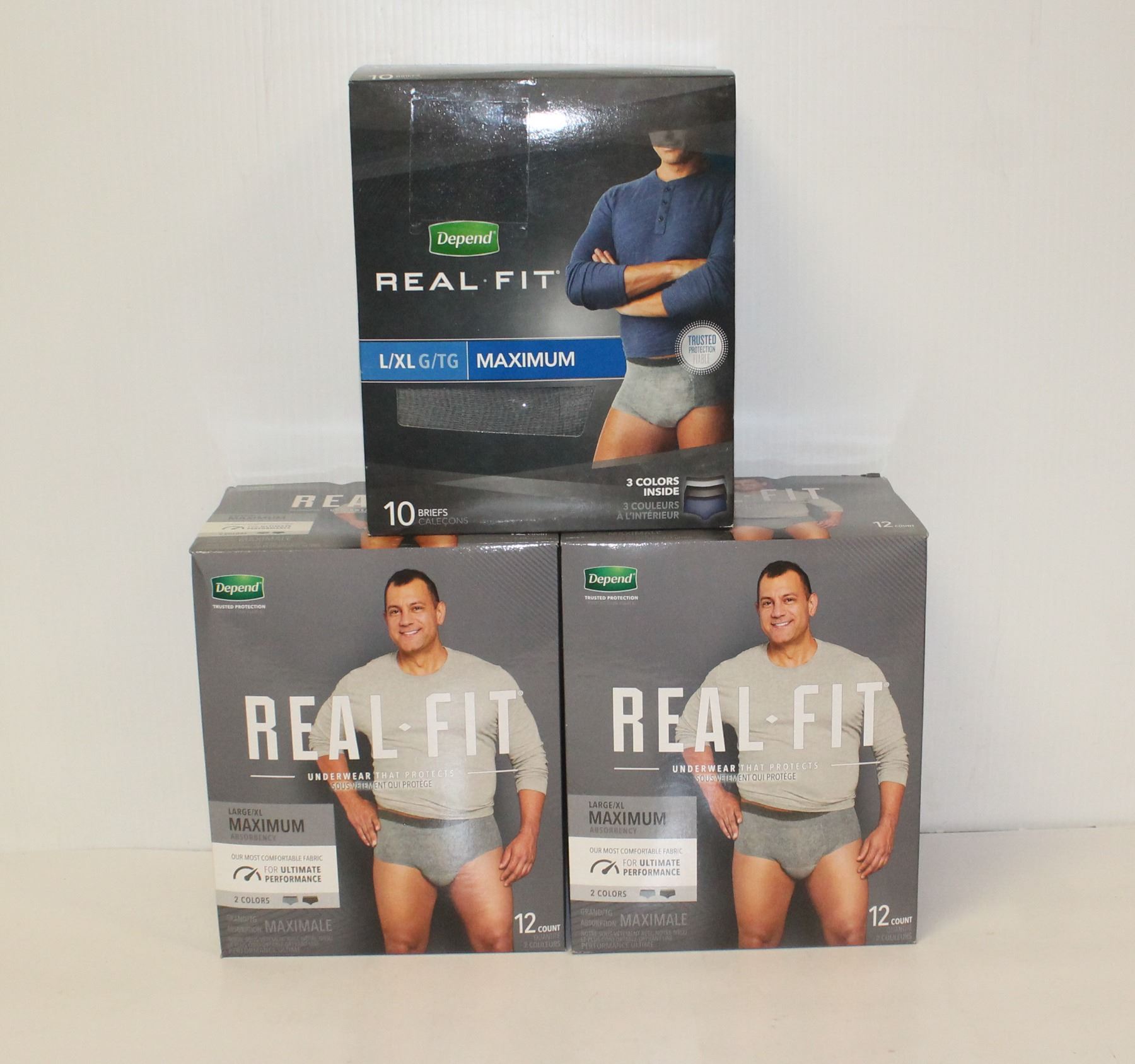3 CASES OF DEPEND REAL-FIT L/XL UNDERWEAR 34 TOTAL.