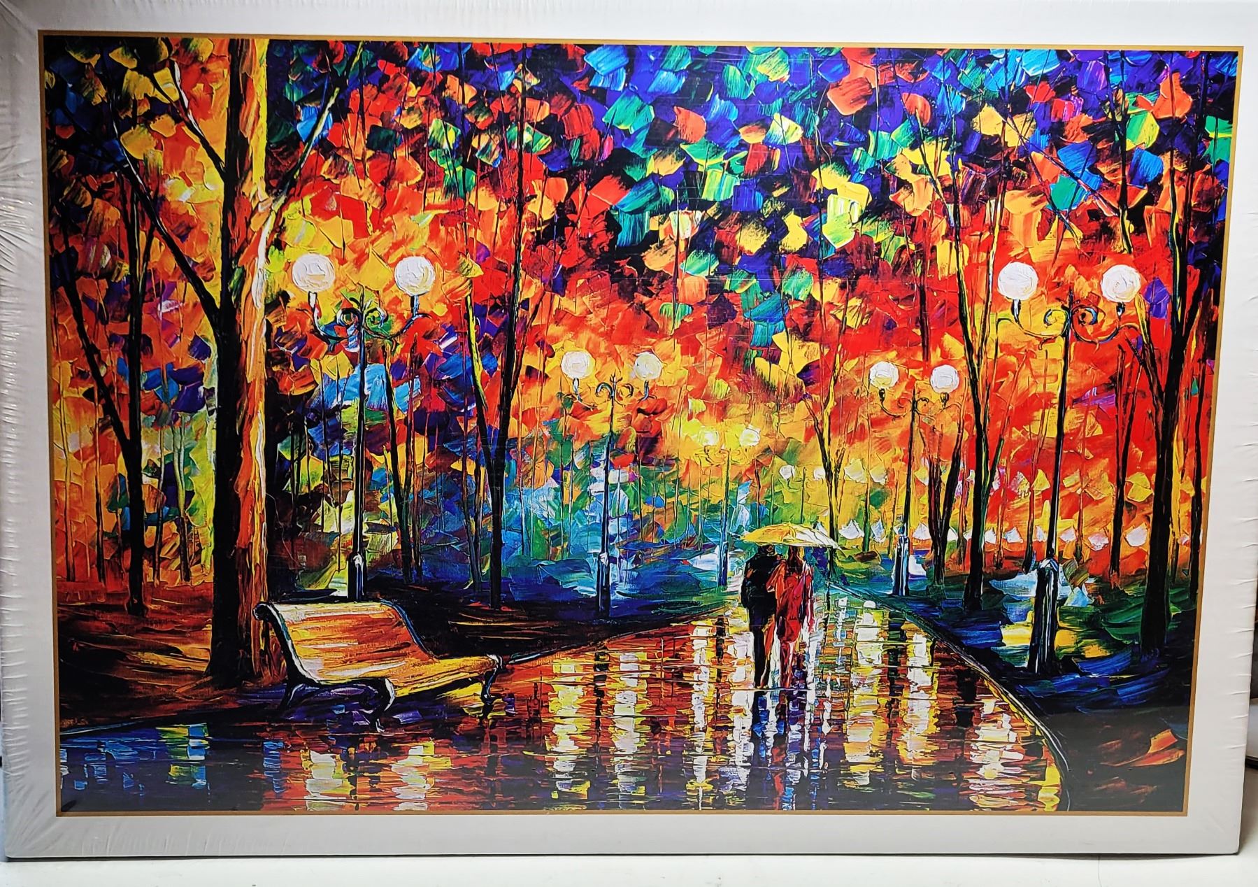 IMPRESSIONIST STREET SCENE OF A COUPLE WALKING IN THE RAIN