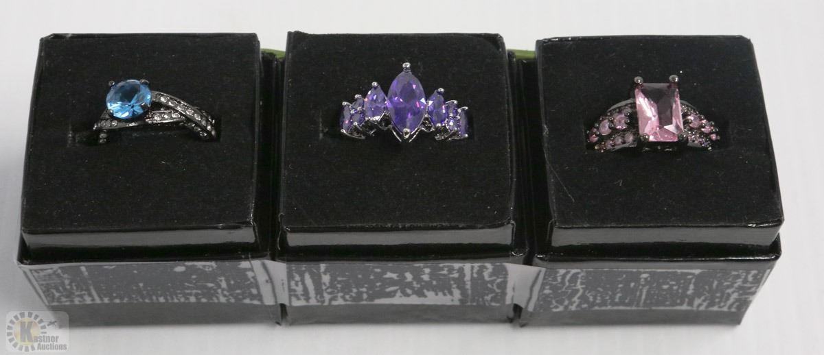 SIZE 8, BLACK WITH BLUE STONE SIZE 8 AND SILVER WITH PURPLE STONES SIZE 8