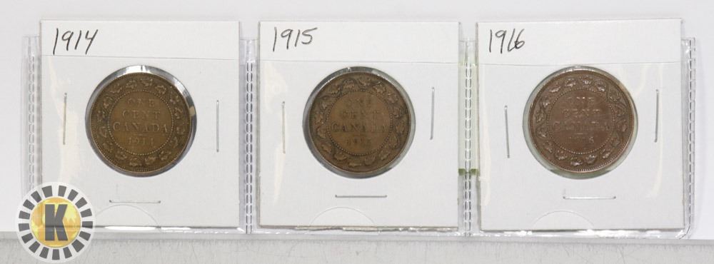 1914 IS THE LOWEST MINTAGE GEORGE V LARGE CENT ISSUE WITH ONLY 3.4M PRODUCED. SET OF 3 DIFFERENT DATES***ITEM IS LOCATED IN LETHBRIDGE ALBERTA, PICKUP IS AT OUR LETHBRIDGE LOCATION ONLY, WORLDWIDE SHIPPING IS AVAILABLE***