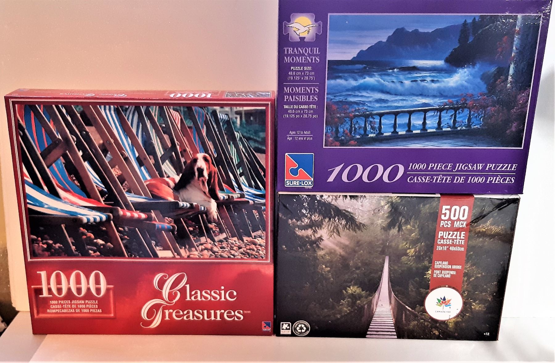 500 PCE CAPILANO SUSPENSION BRIDGE, 1000 PCE "TRANQUIL MOMENTS" & 1000 PCE BASSET HOUND ON A BEACH CHAIR. TOYS