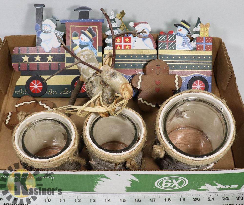 HANDLES, SNOWMAN TRAIN WITH 3 PANELS, 3 WOODEN GINGERBREAD MEN, ONE BIRCH DEER WITH TWIG ANTLERS. SEASONAL