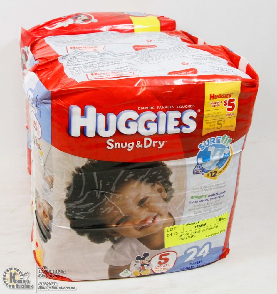 3 PACKS OF 25 SIZE 5 HUGGIES DIAPERS 27LBS.