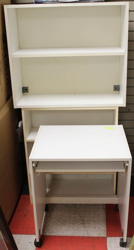 WHEELS W/PULLOUT KEYBOARD/PAPER TRAY (24"L X 28"H X 20"W), 3-SHELF BOOKSHELF (27.5"L X 33"H X 9.5"W) & 2 SHELF BOOKSHELF (31.5"L X 27.5"H X 11"W)