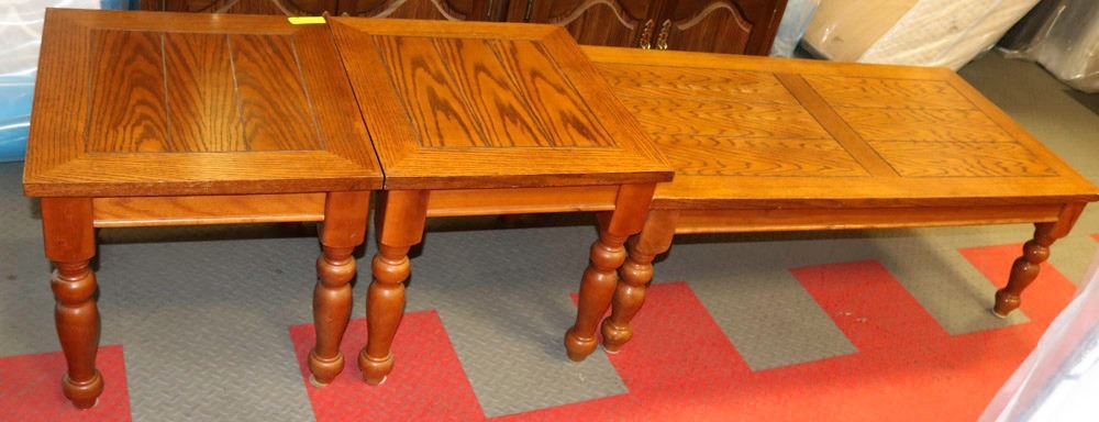3 PC WOOD TONE COFFEE TABLE SET (CORNER DAMAGE)