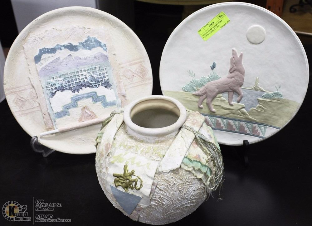 ONE SIGNED BY THE ARTIST - VASE 9"X9"; PLATES 12" & 13" DIAMETER - INCLUDES PLATE HOLDERS